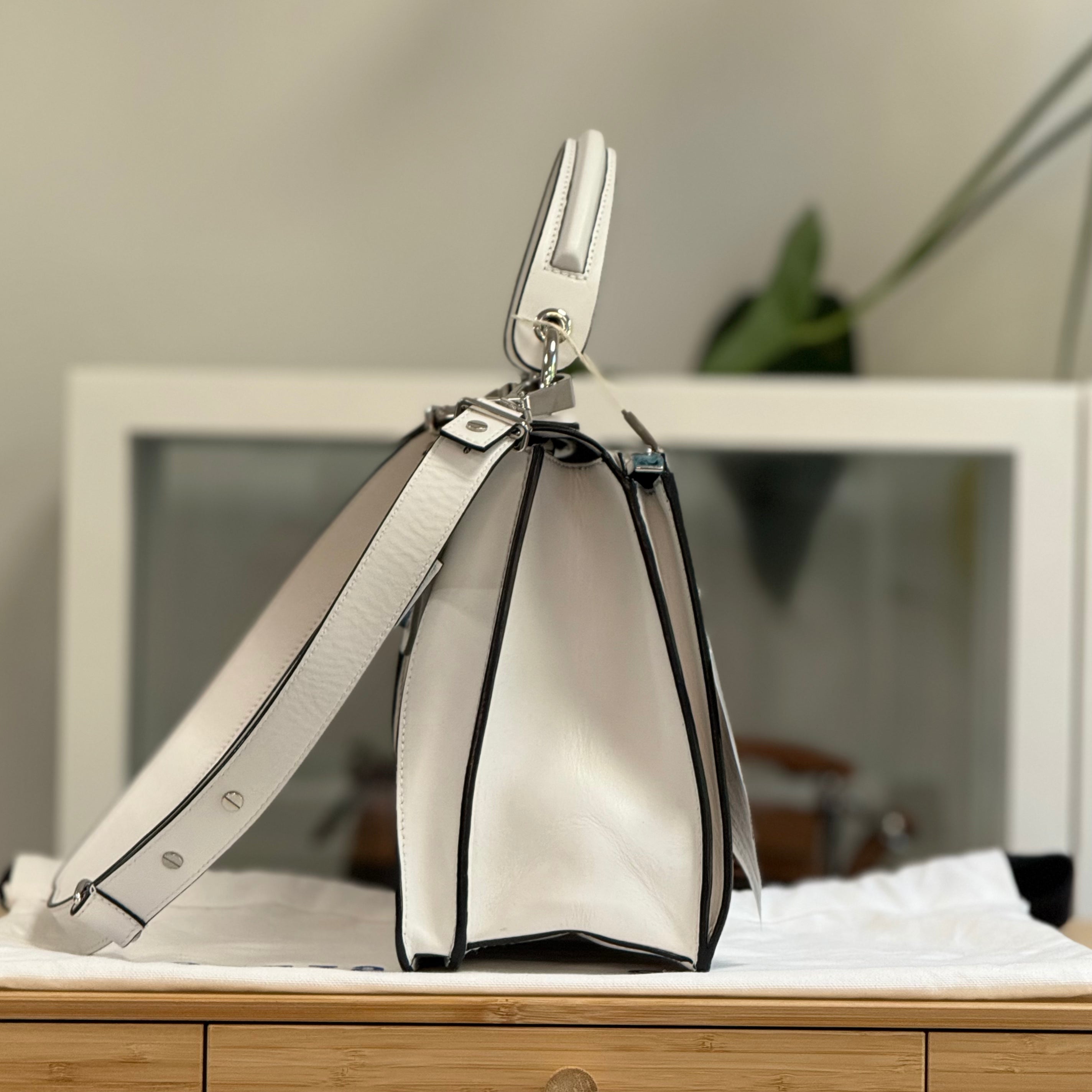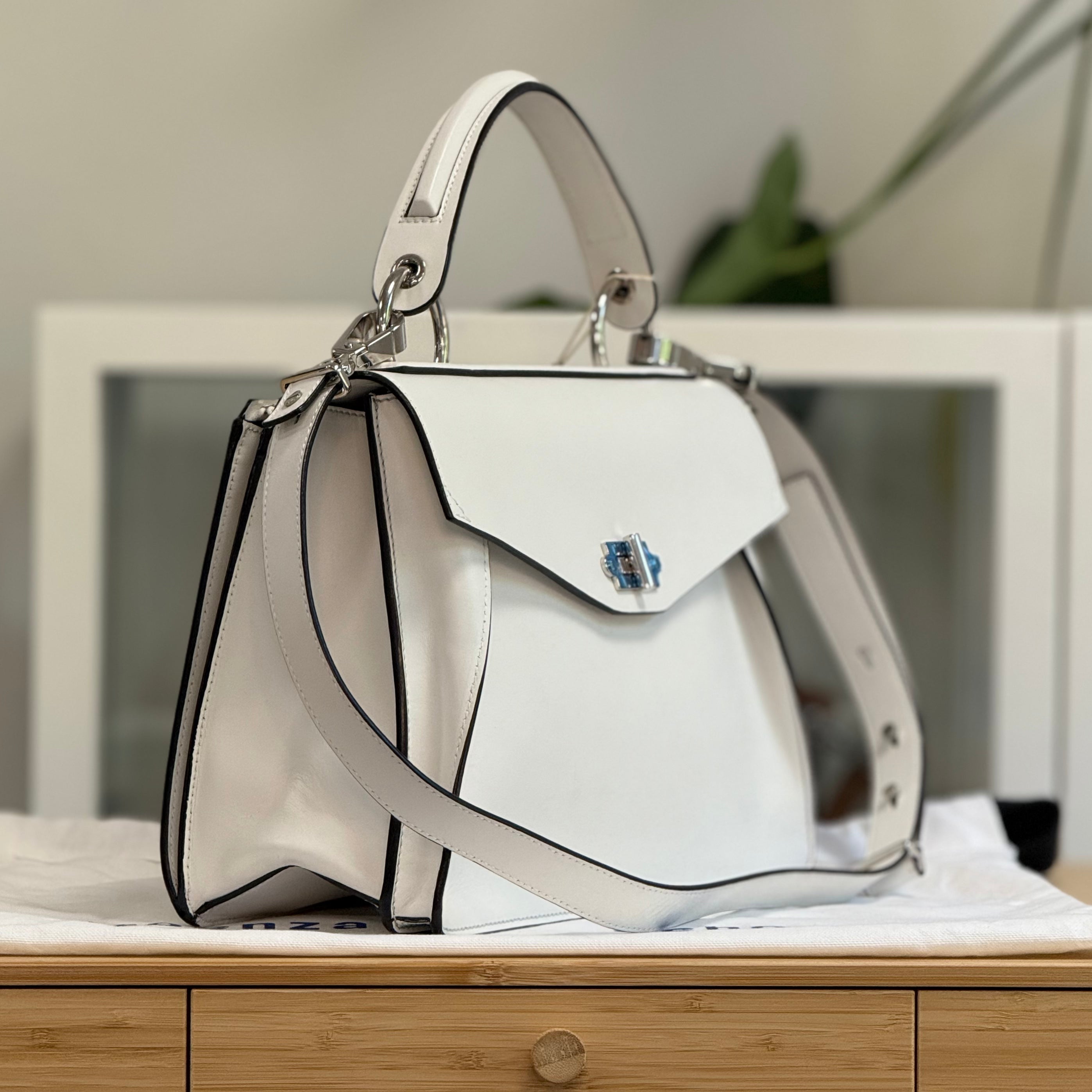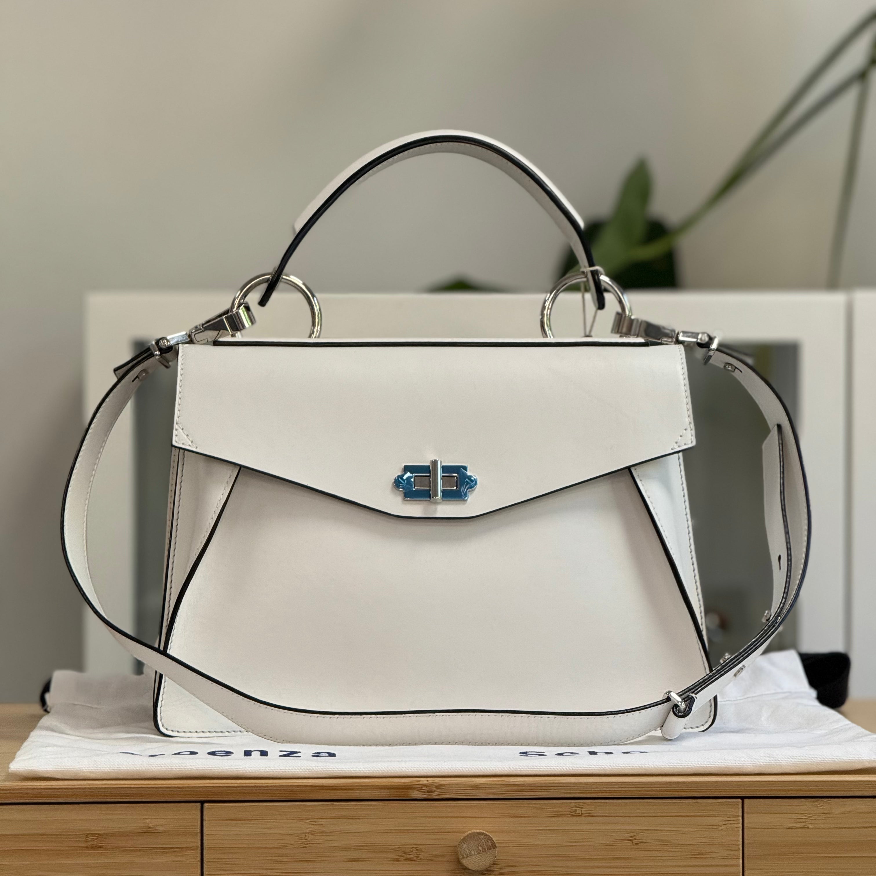 Description: This Proenza Schouler Hava Top Handle has a top handle and a removable & adjustable strap. It has an exterior zipped pocket on the back of the bag. It has a flap closure with a turn-lock fasten, and a chain fasten underneath the flap closure. Inside it has 2 flat pockets.