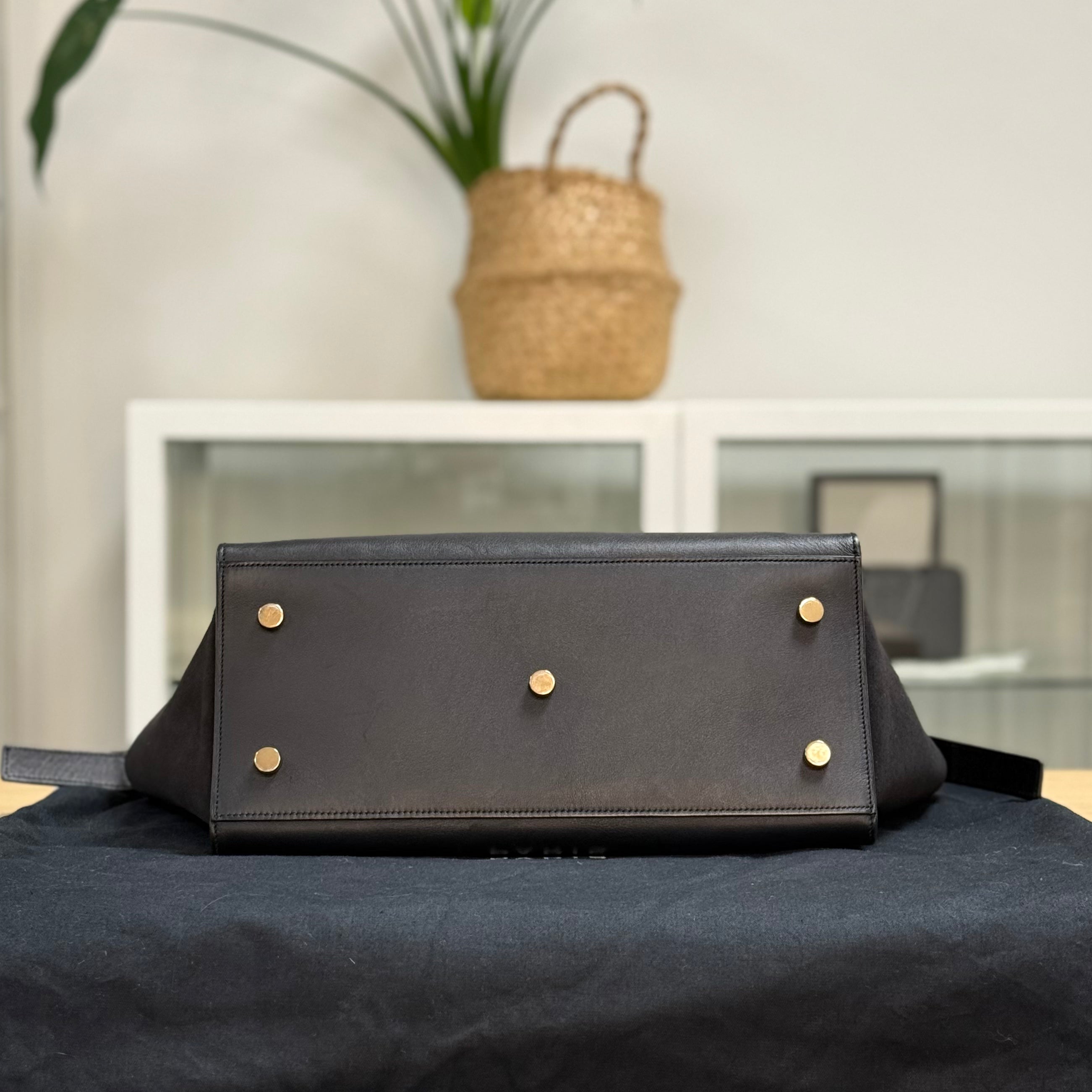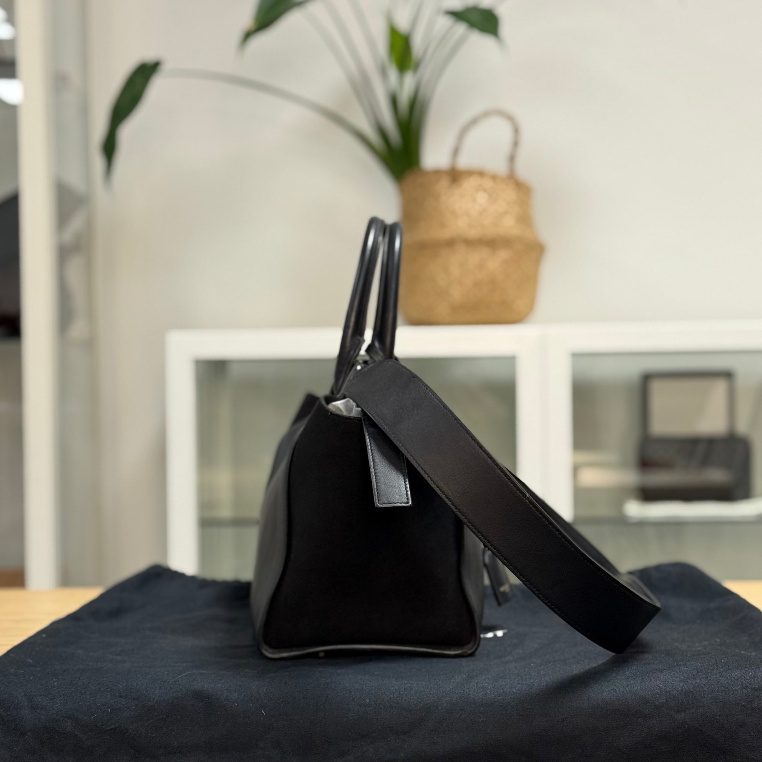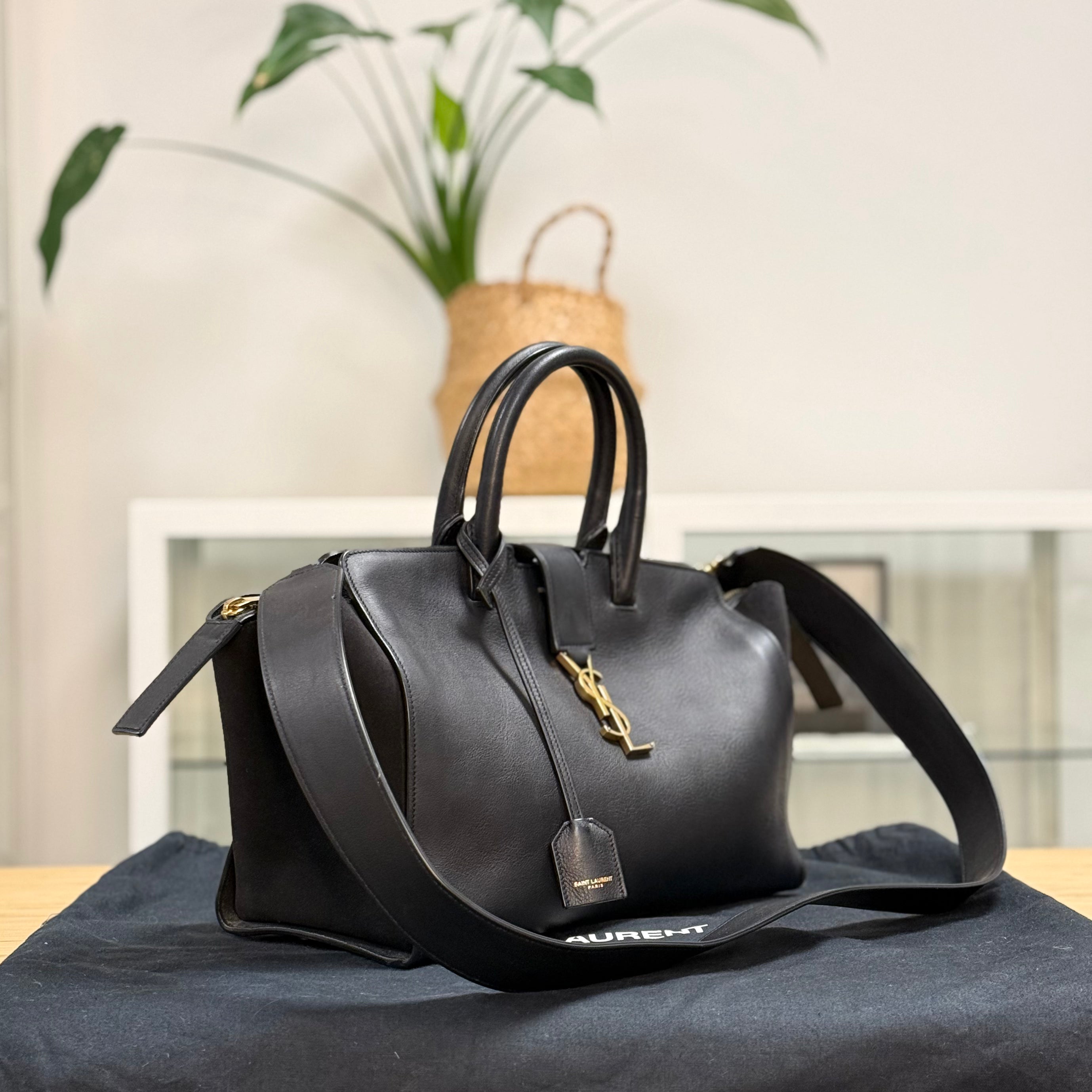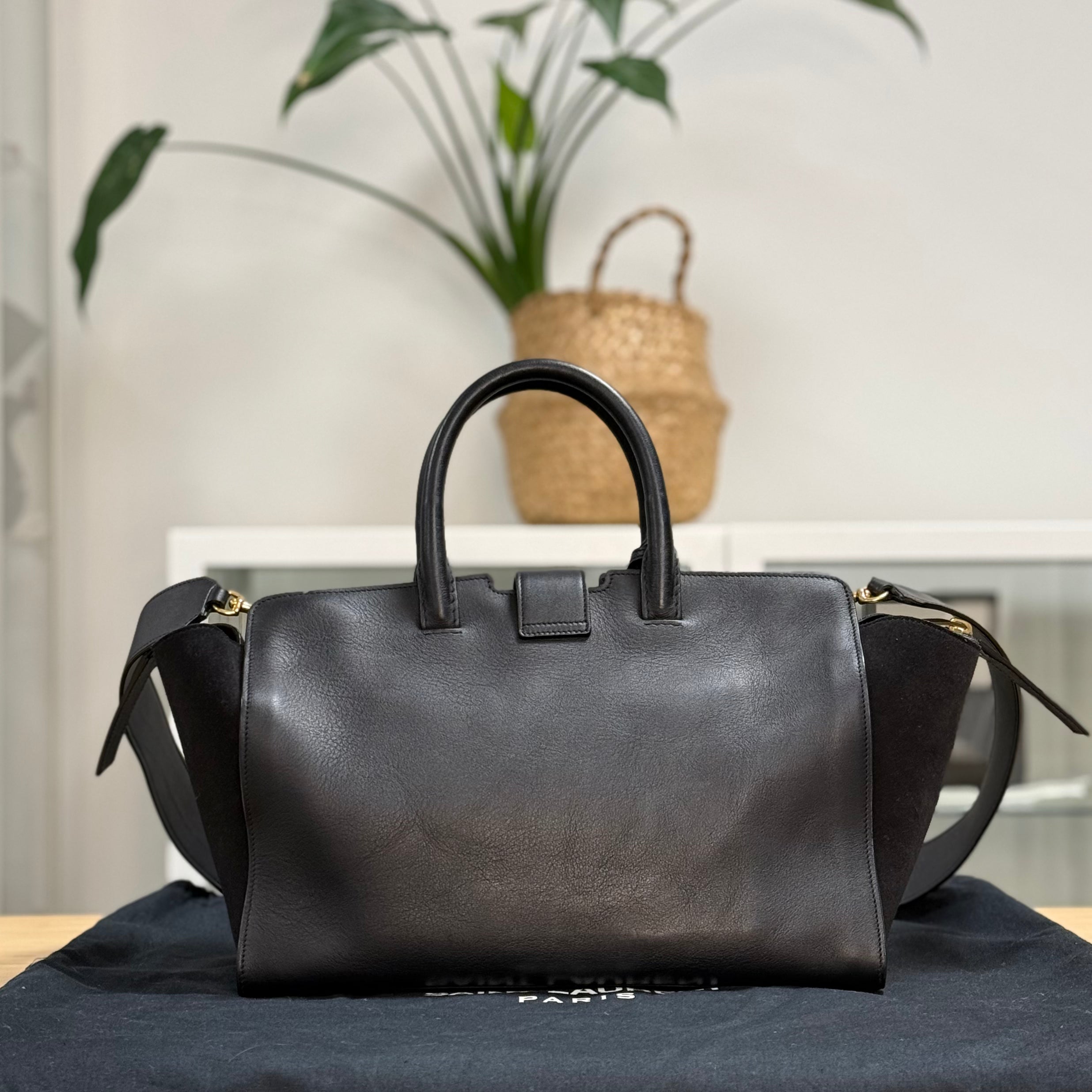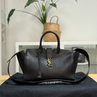 Description: This Saint Laurent Monogram Downtown Cabas has a zip closure and a magnetic fasten. It has double top handles and a removable strap. It has 5 studs on the base. Inside it has 1 flat pocket.