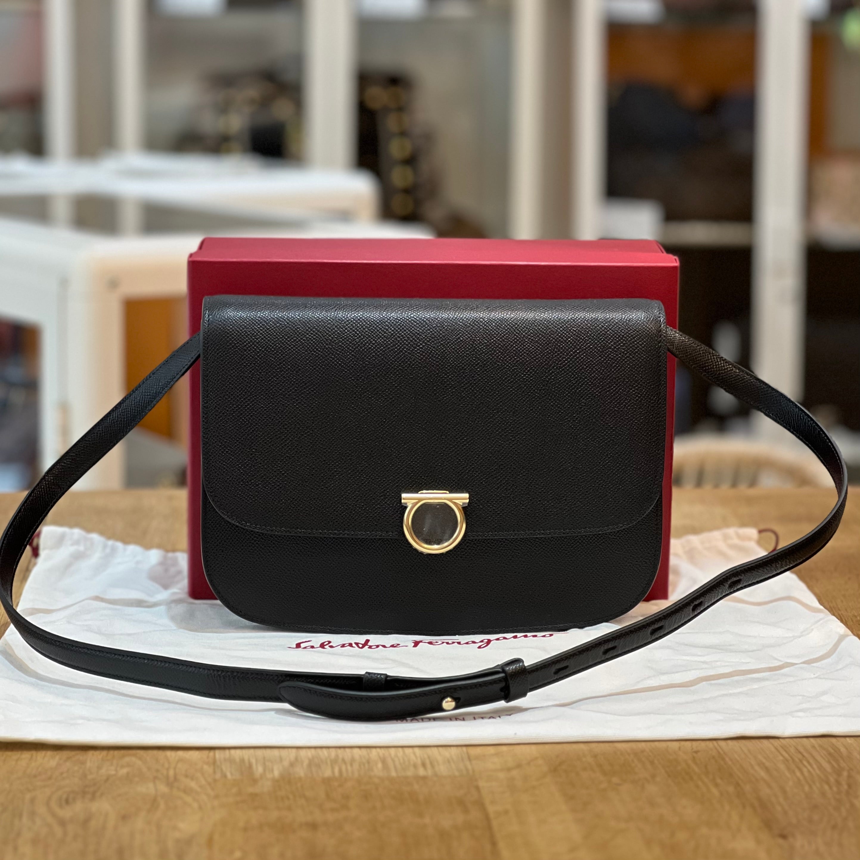 Description: This Salvatore Ferragamo Gancini has a removable and astable strap, and a flap closure with a flip-lock fasten. Inside there are 4 flat pockets.