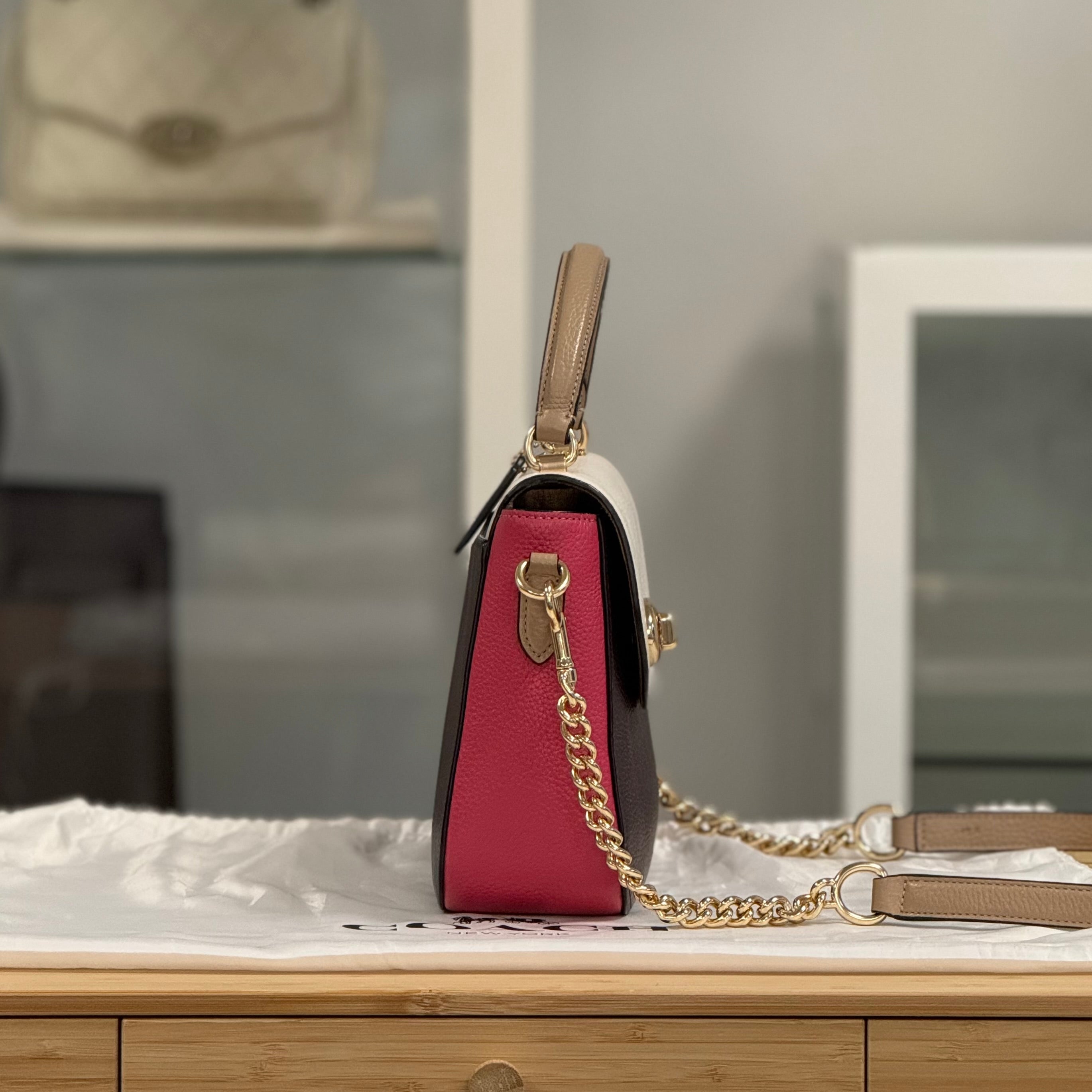 Description: This Coach Marlie Top Handle Satchel has a top handle and a removable & adjustable long strap. It has a flap closure with twistock fasten. Inside it has 1 zipped and 1 flat pocket.