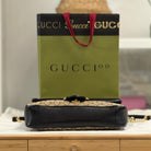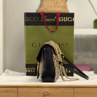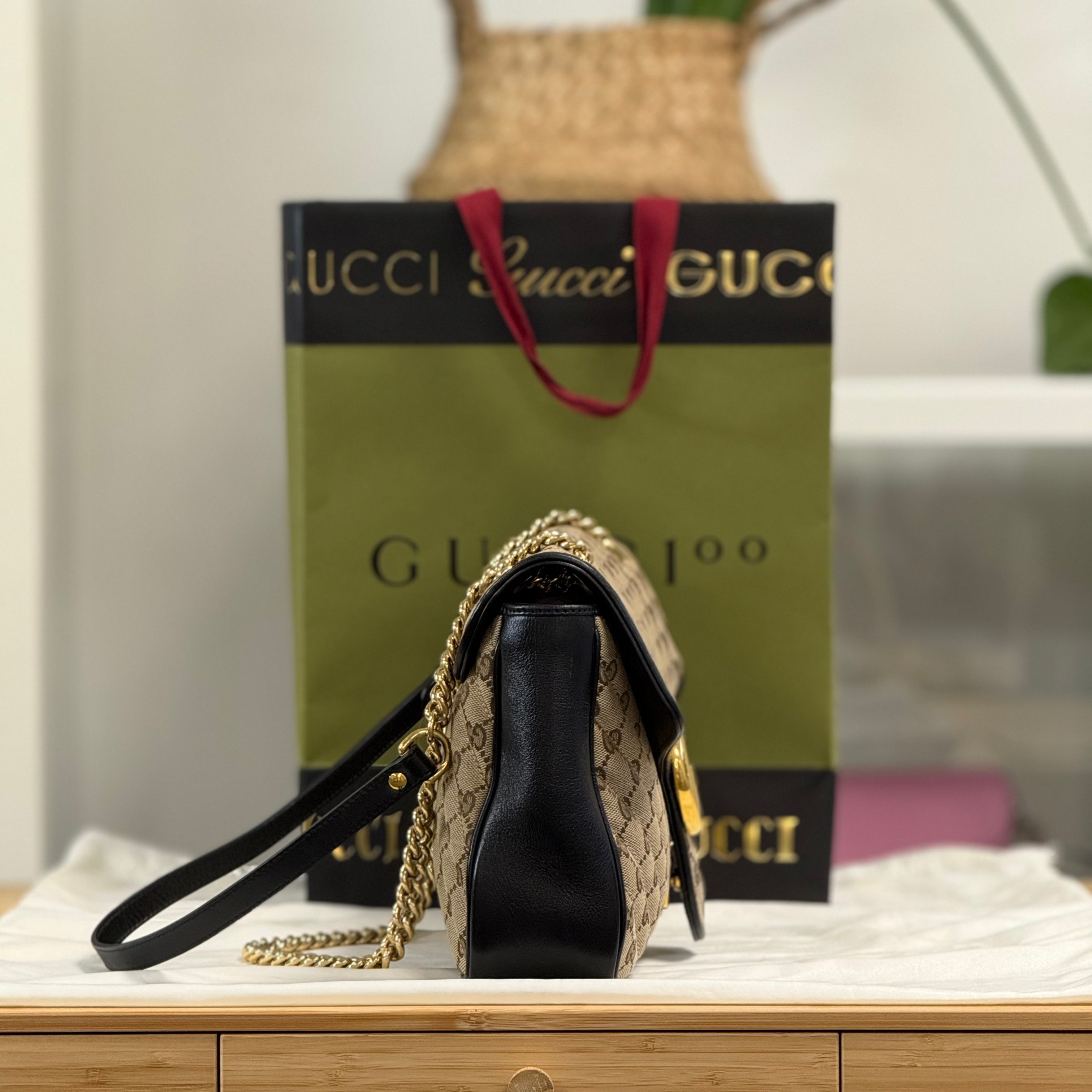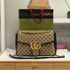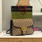 Description: This Gucci GG Supreme Marmont Shoulder in size large has an adjustable strap and a flap closure with a push-lock fasten. Inside there is 1 zipped pocket and 1 flat pocket.