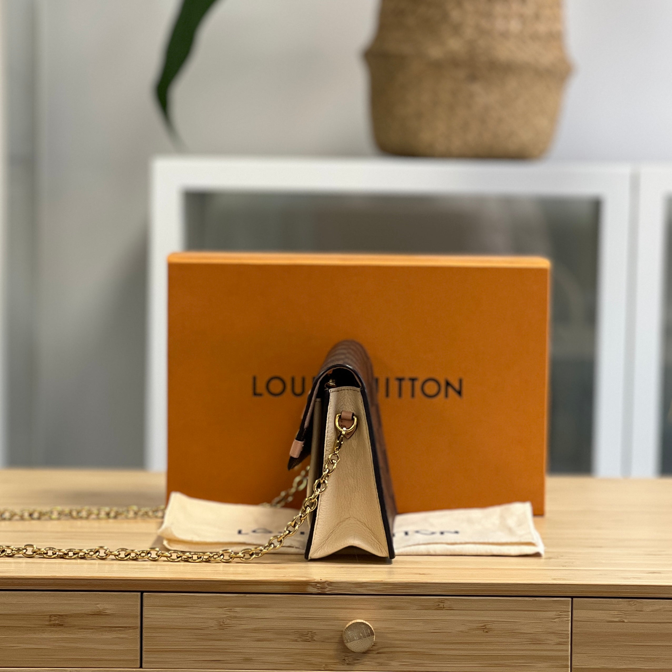 Description: This Louis Vuitton Vavin Chain Wallet has a removable strap and a flap closure with a magnetic press-stud fasten. Underneath the flap closure there is 1 flat pocket. Inside there are 6 card slots, 1 flat pocket and 1 zipped pocket.