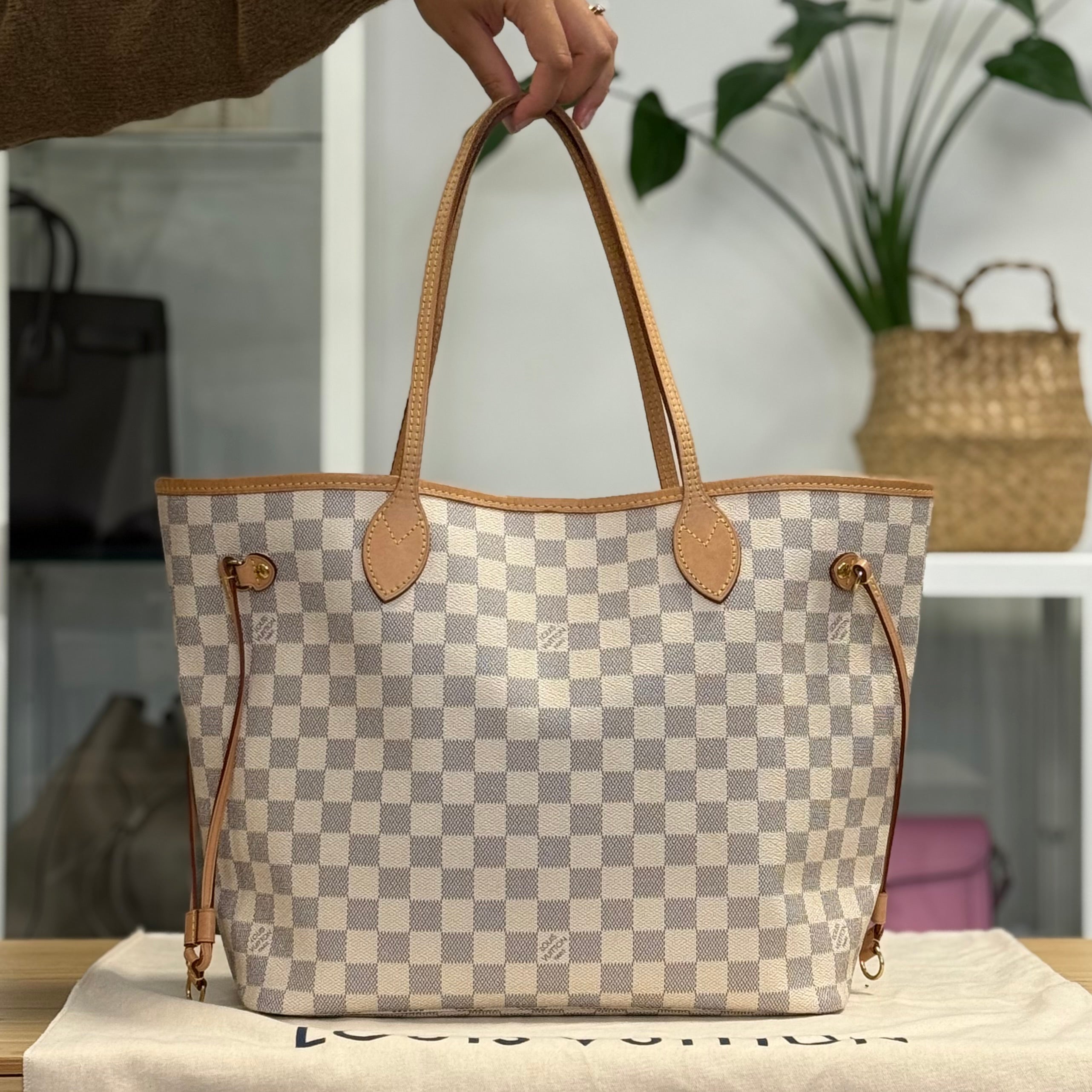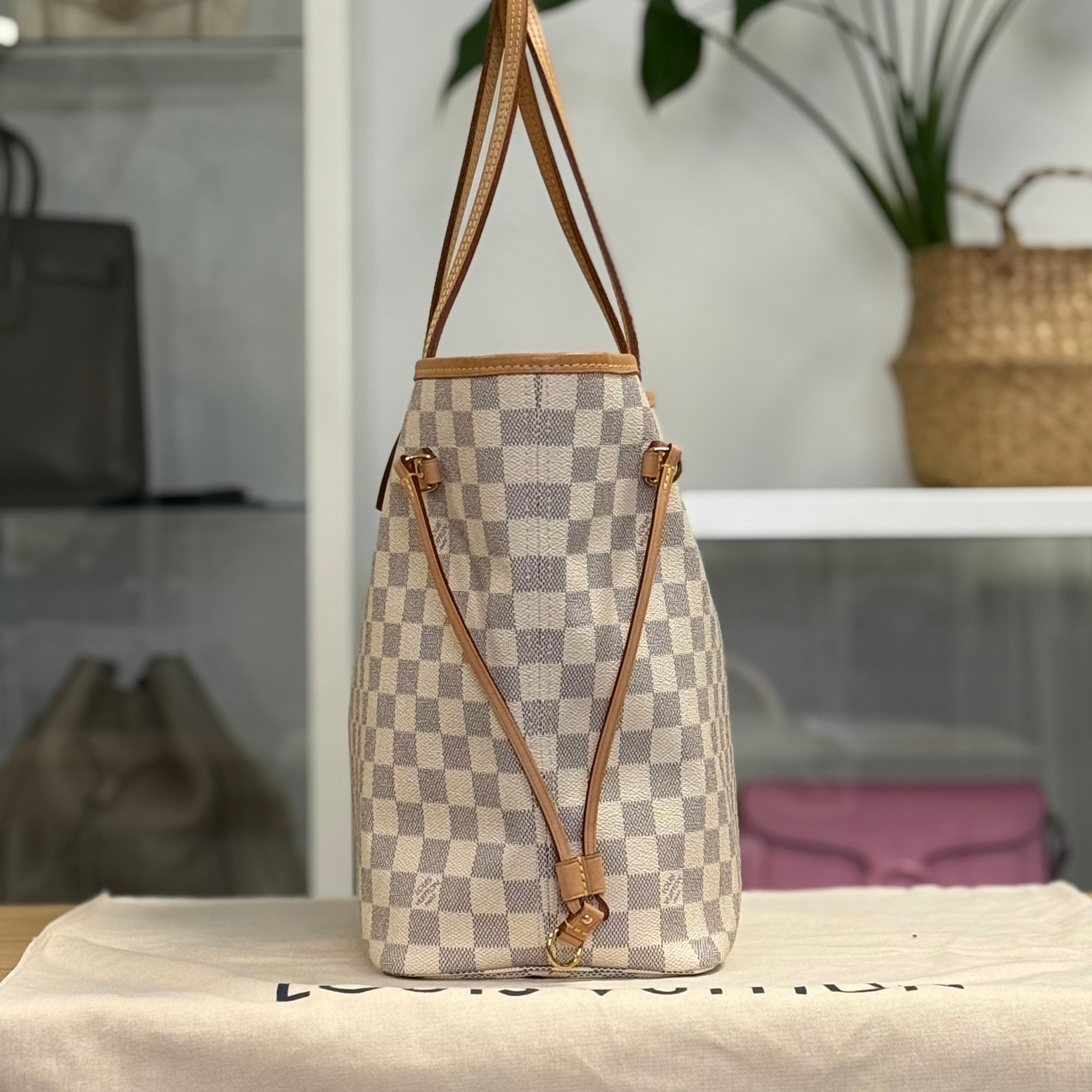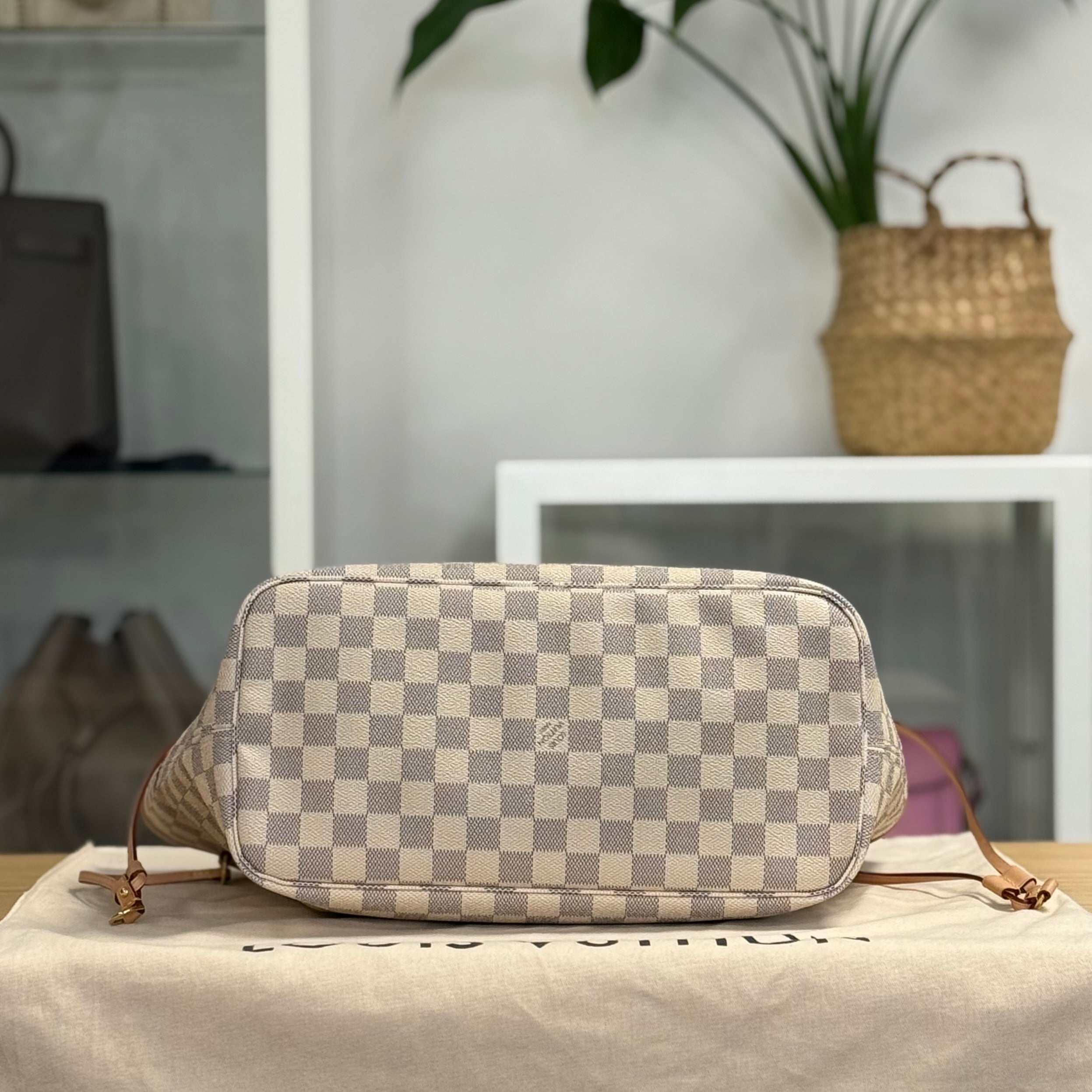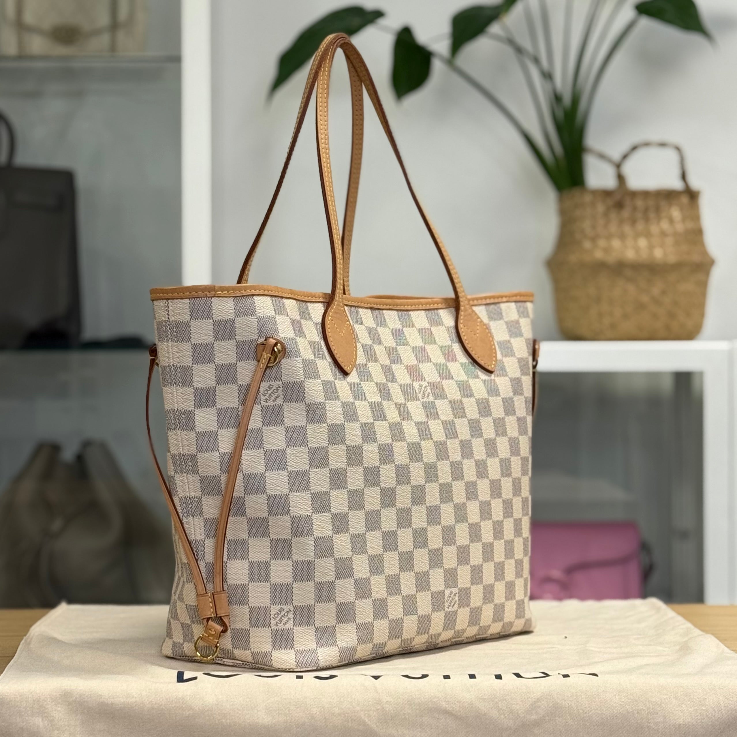 Description: This Louis Vuitton Neverfull MM has double top handles and adjustable laces on each side. It has a clip-fasten. Inside there is 1 zipped pocket. It was bought in 2024.