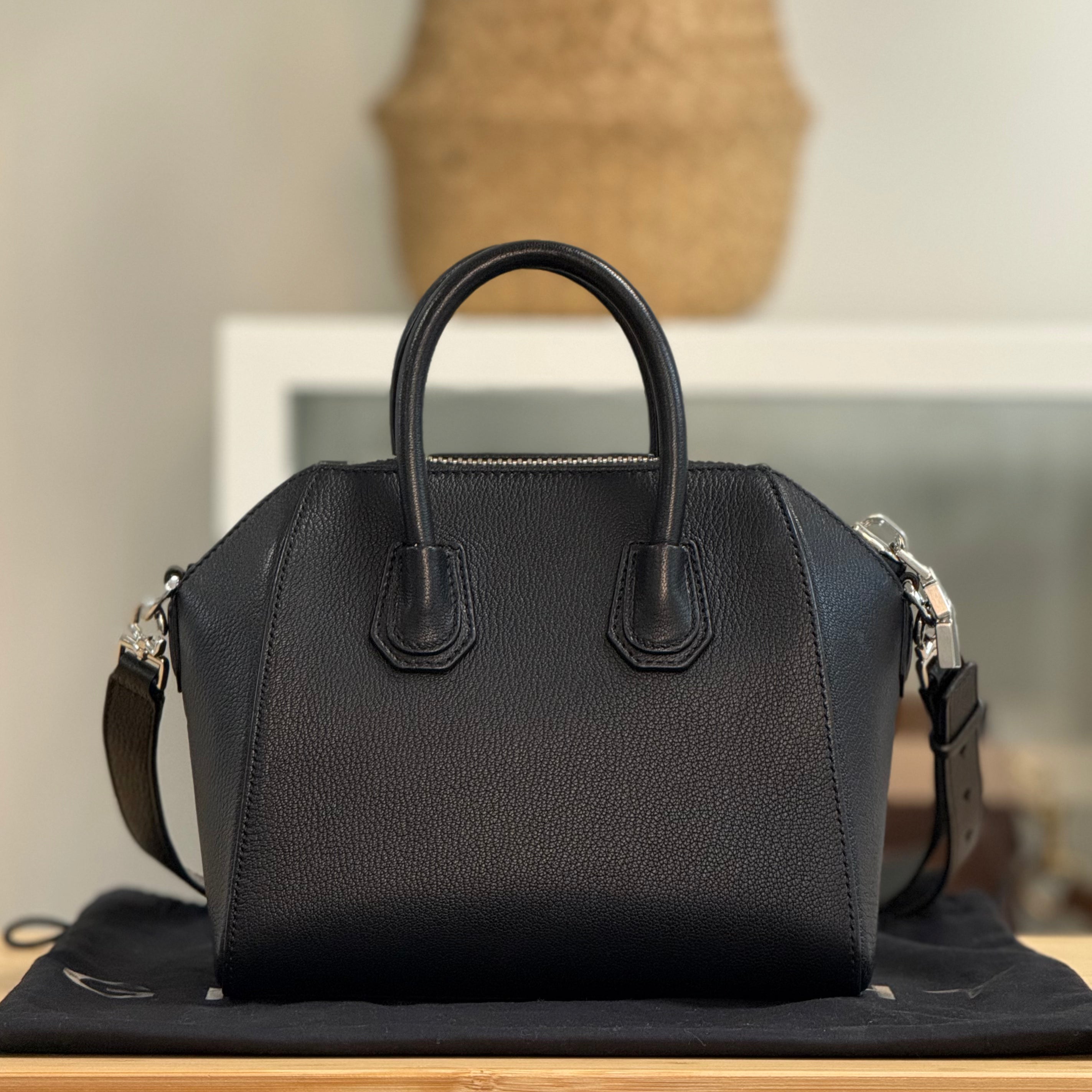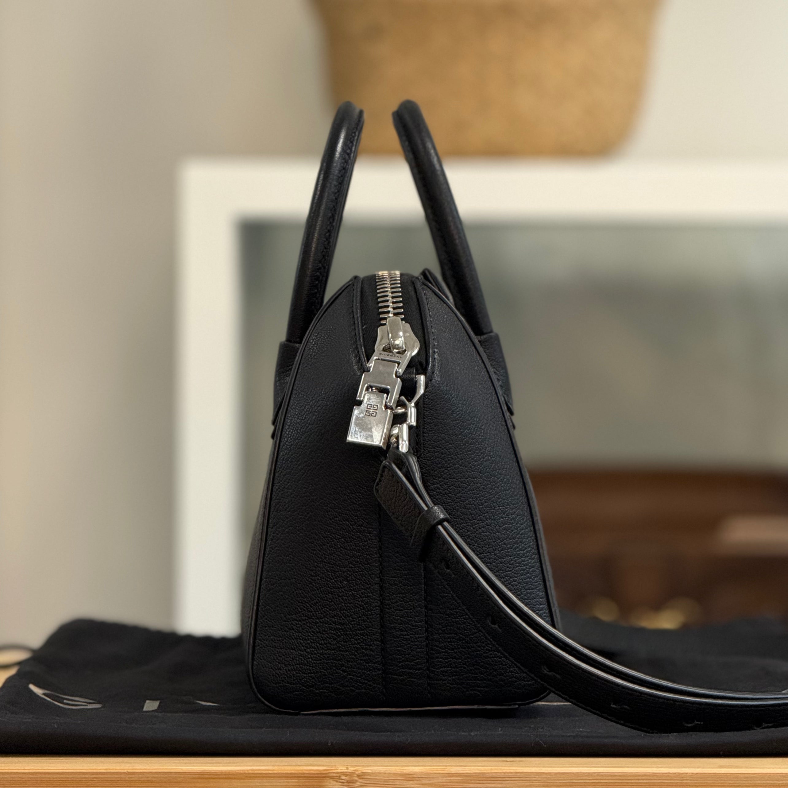 Description: This Givenchy Antigona has double top handles and a removable and adjustable strap. It has a zip top closure. Inside there is one main compartment with a zipped pocket.
