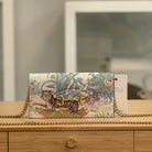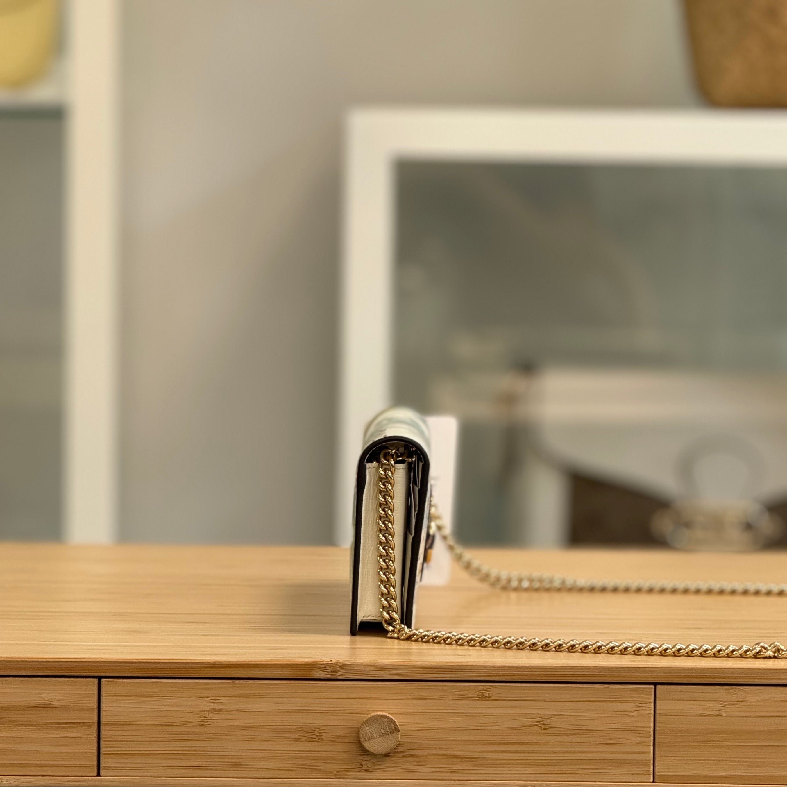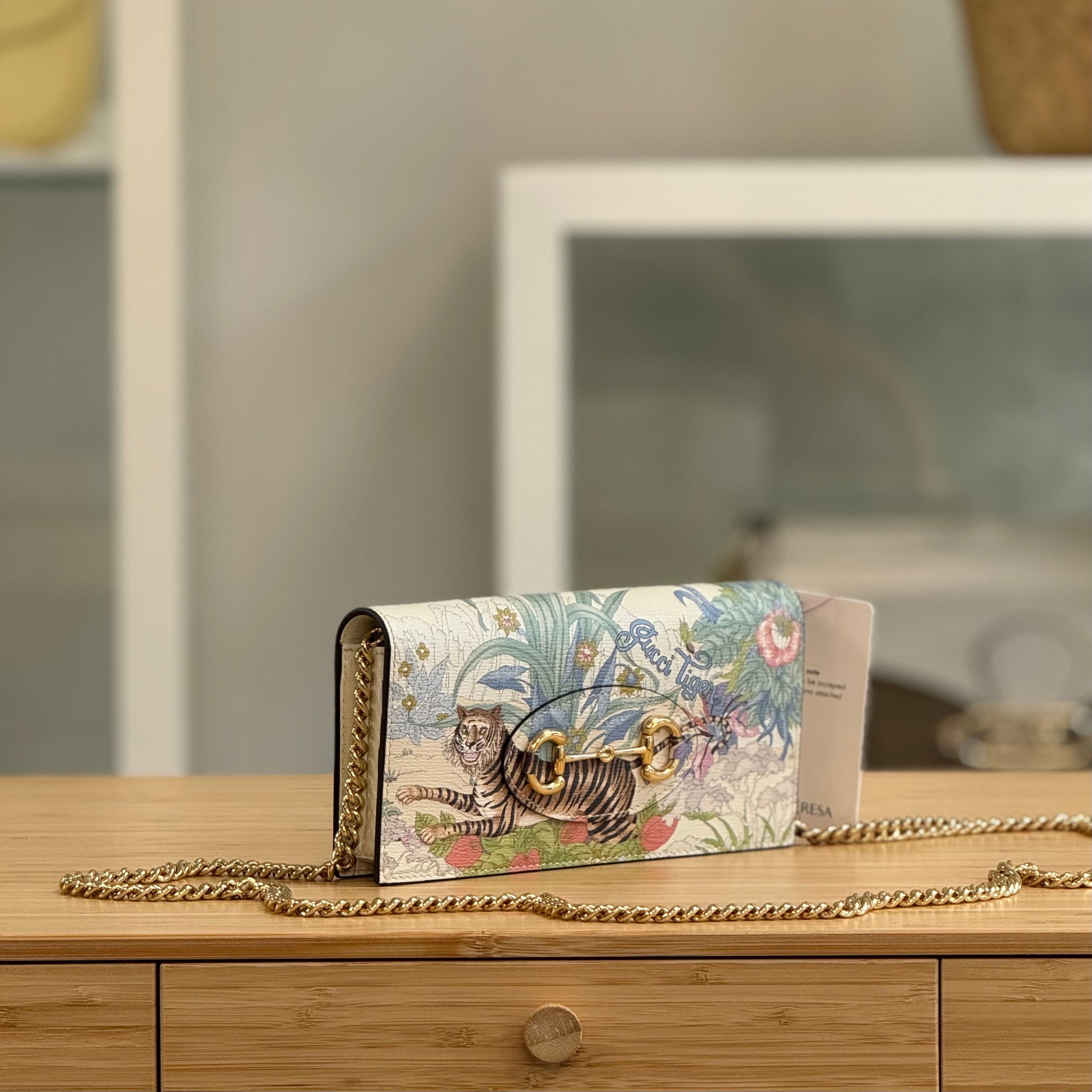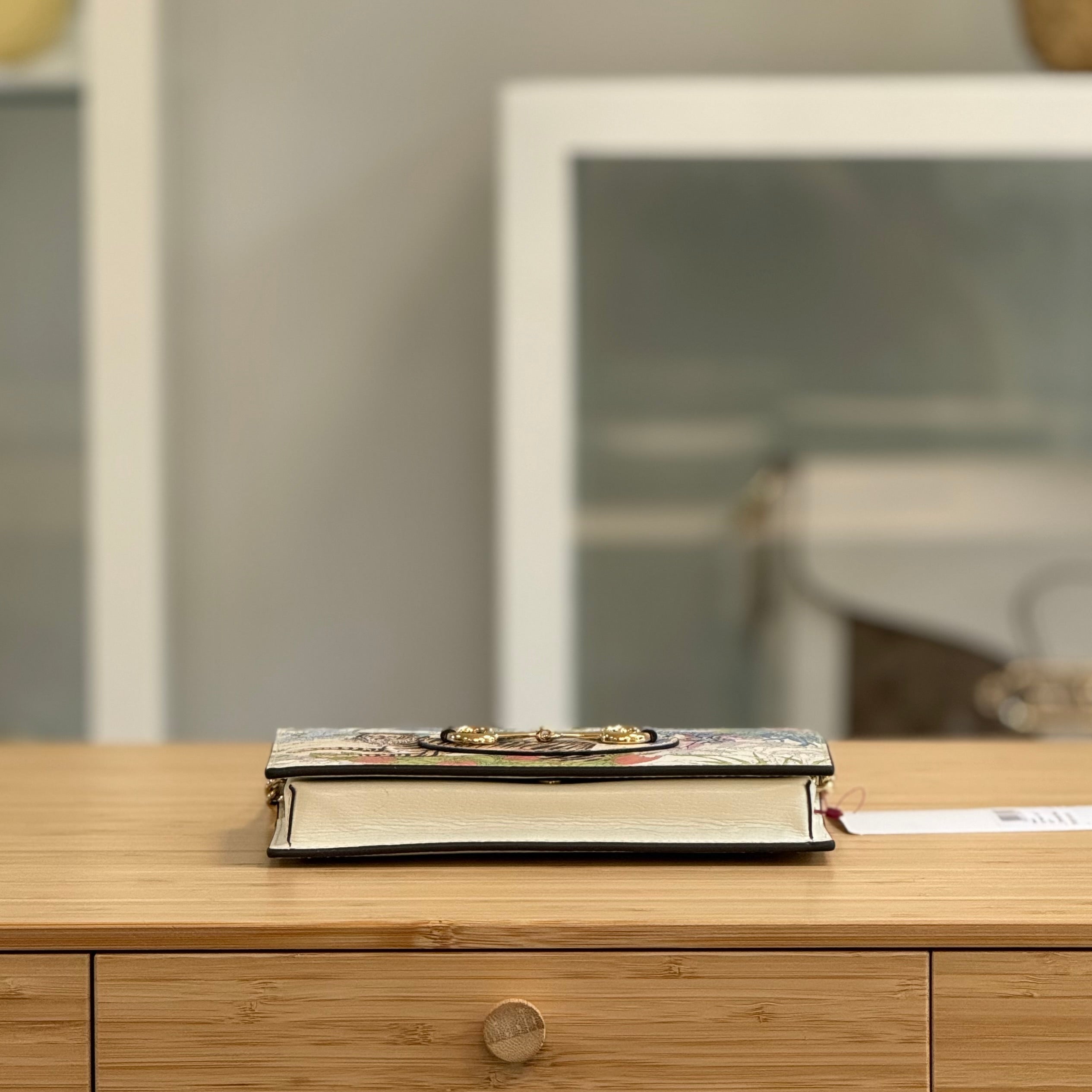 Description: This Gucci Tiger 1955 Horsebit WOC has a removable strap and a flap closure with a press-stud fasten. Inside there is 1 zipped pocket, 1 flat pocket and 6 card slots.