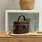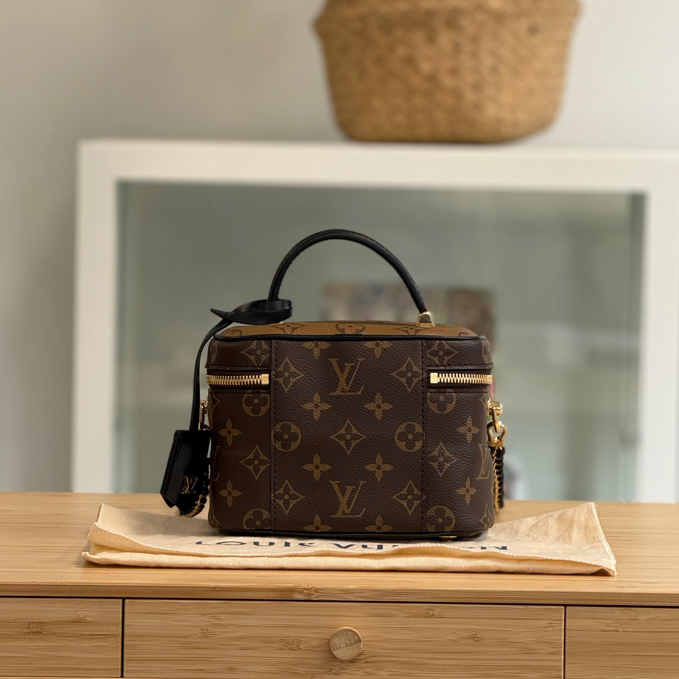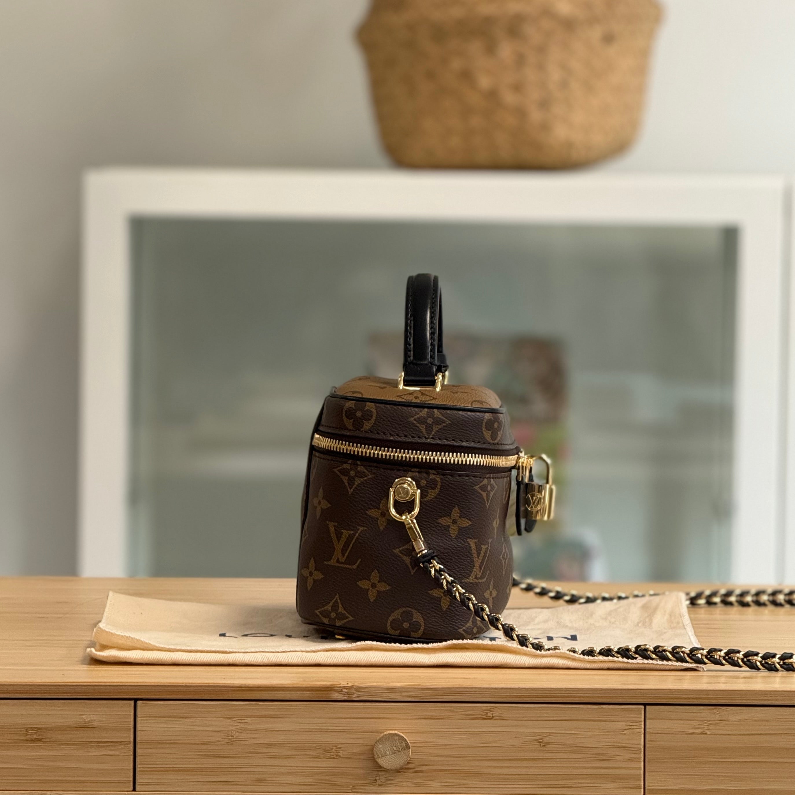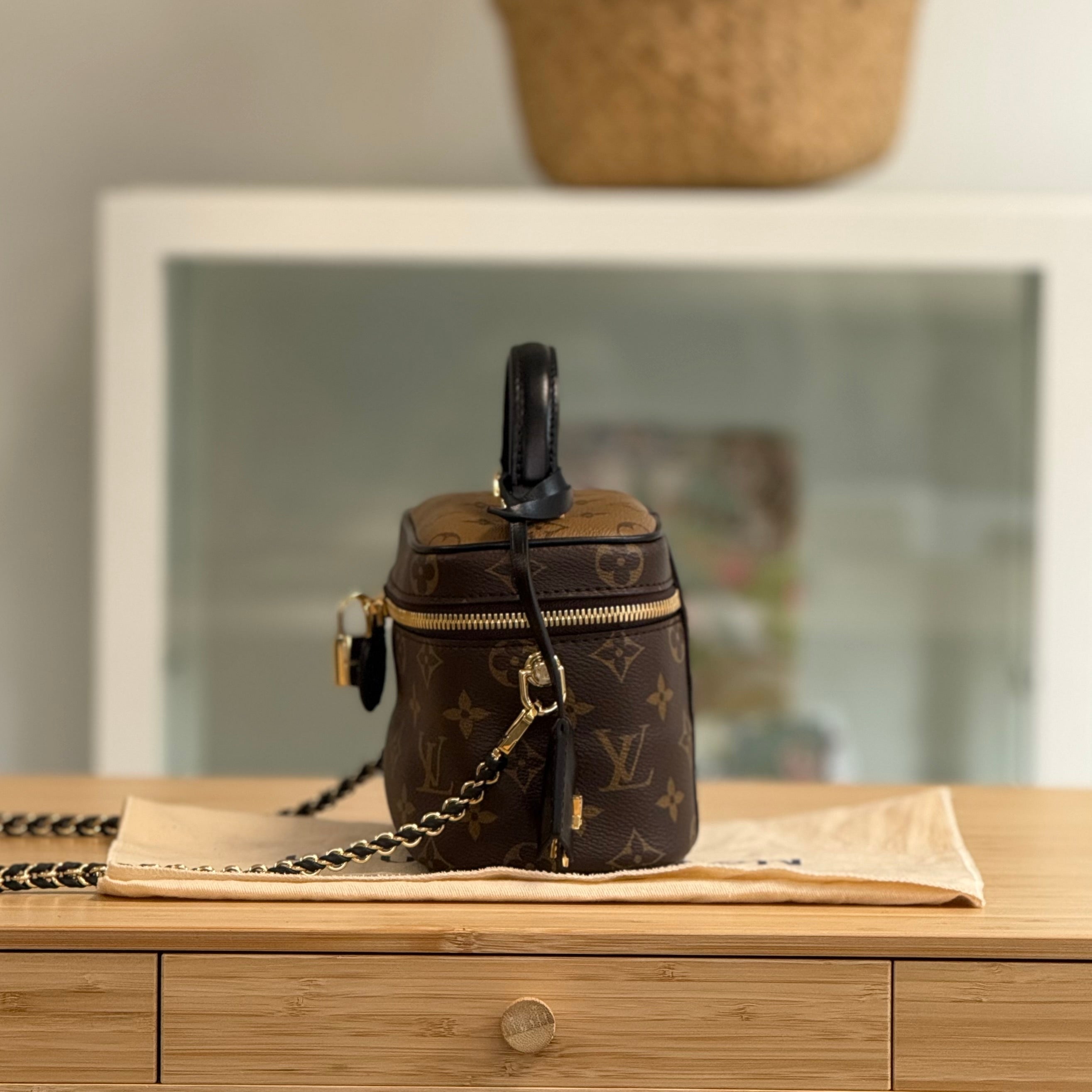Description: This Louis Vuitton Vanity PM has a top handle and a removable strap. It has 4 base studs. It has a lid closure with a zip-around fasten. Inside there is 1 flat pocket. The date code is AA4200.