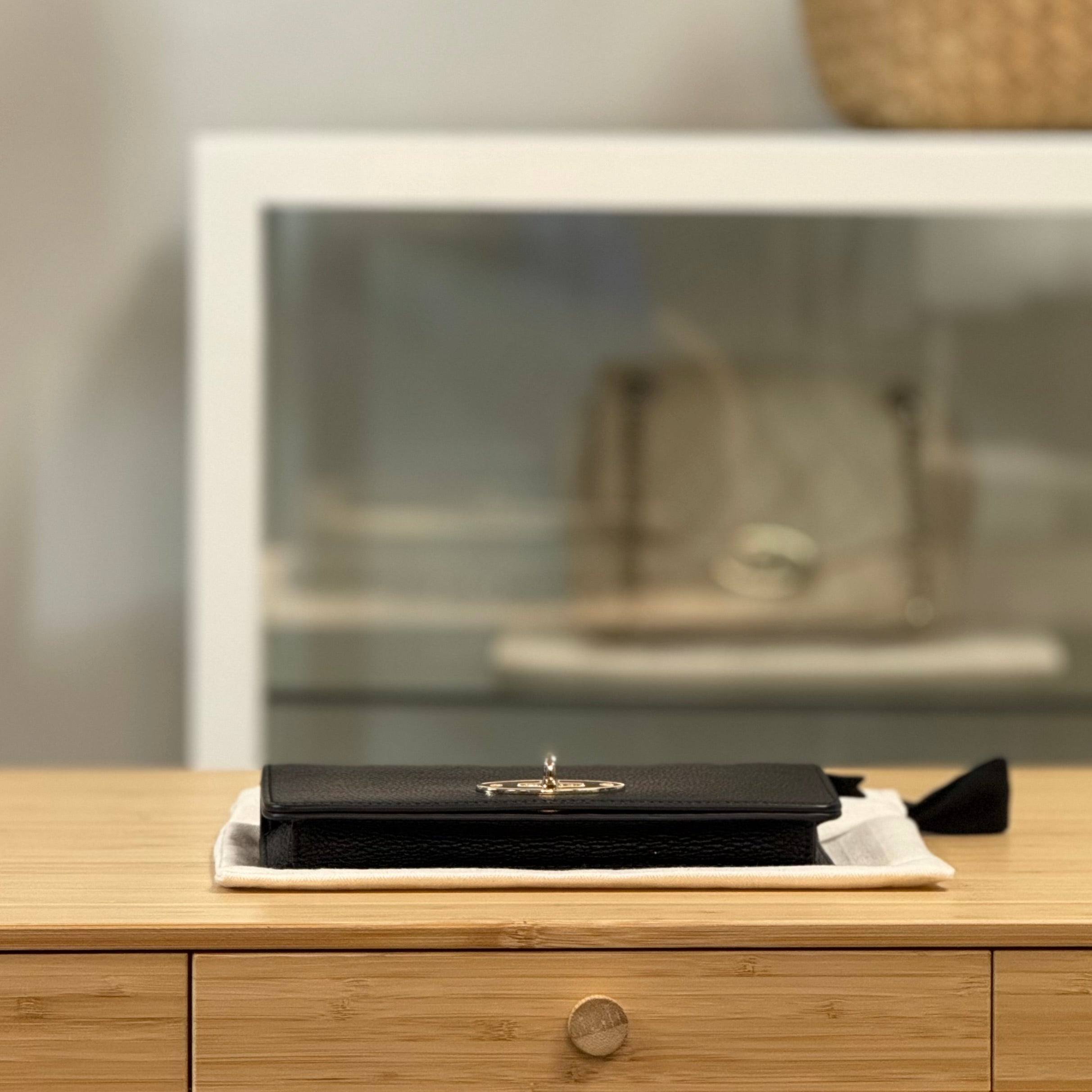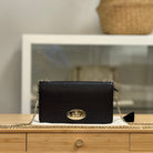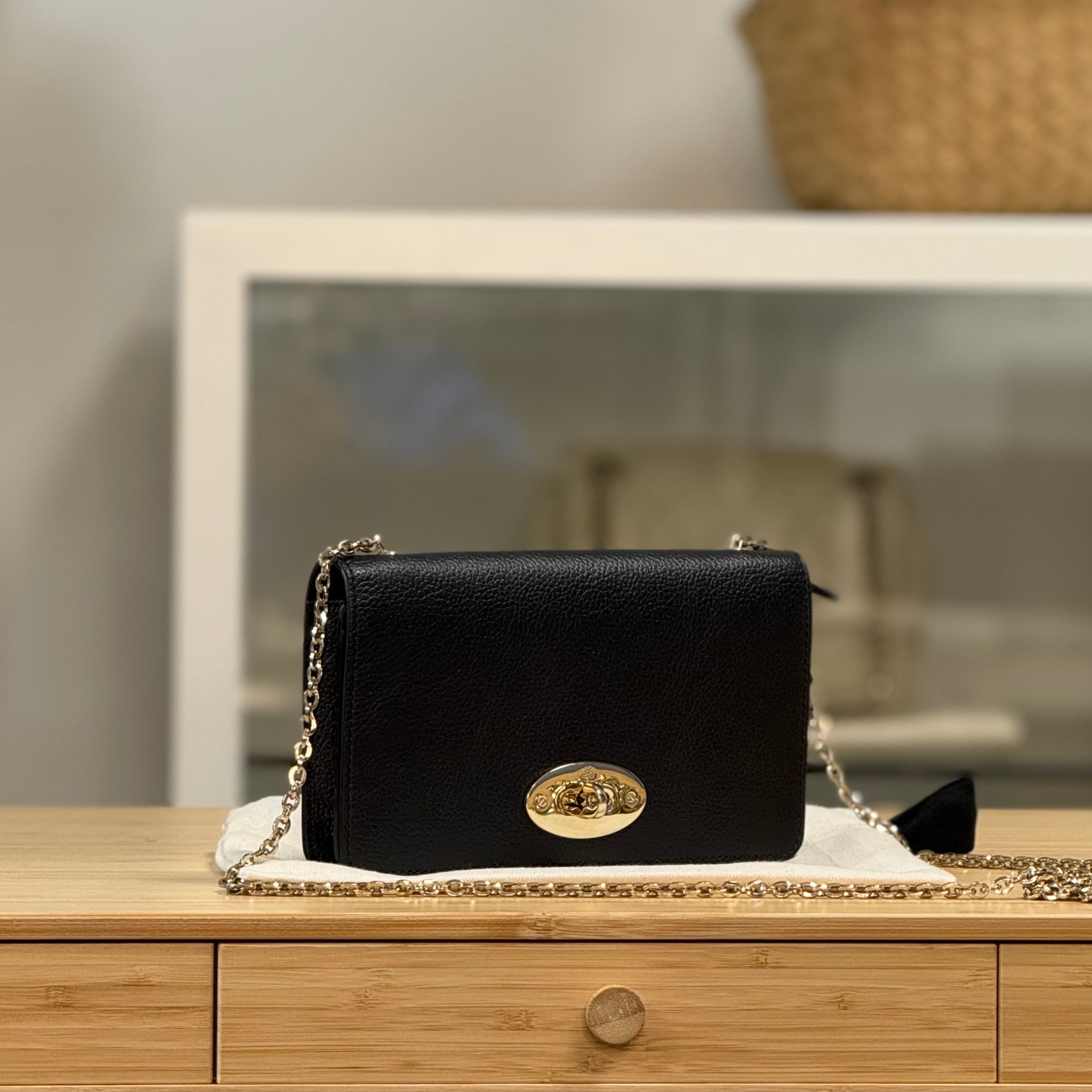 Description: This Mulberry Bayswater Clutch Wallet has a removable chain strap and a flap closure with a mini Mulberry postman’s lock. Inside there are 4 card slots, 2 flat pockets and 1 zipped compartment.