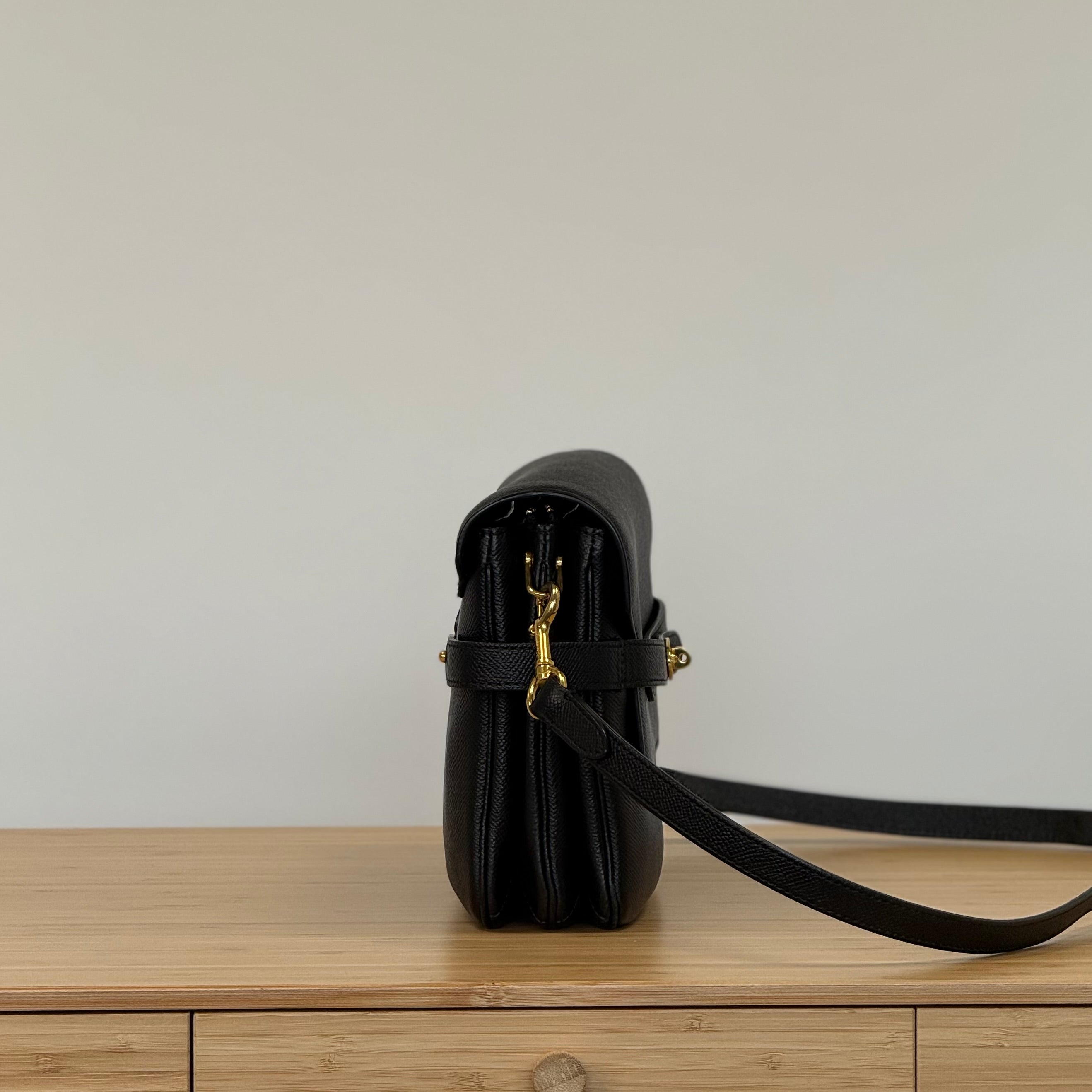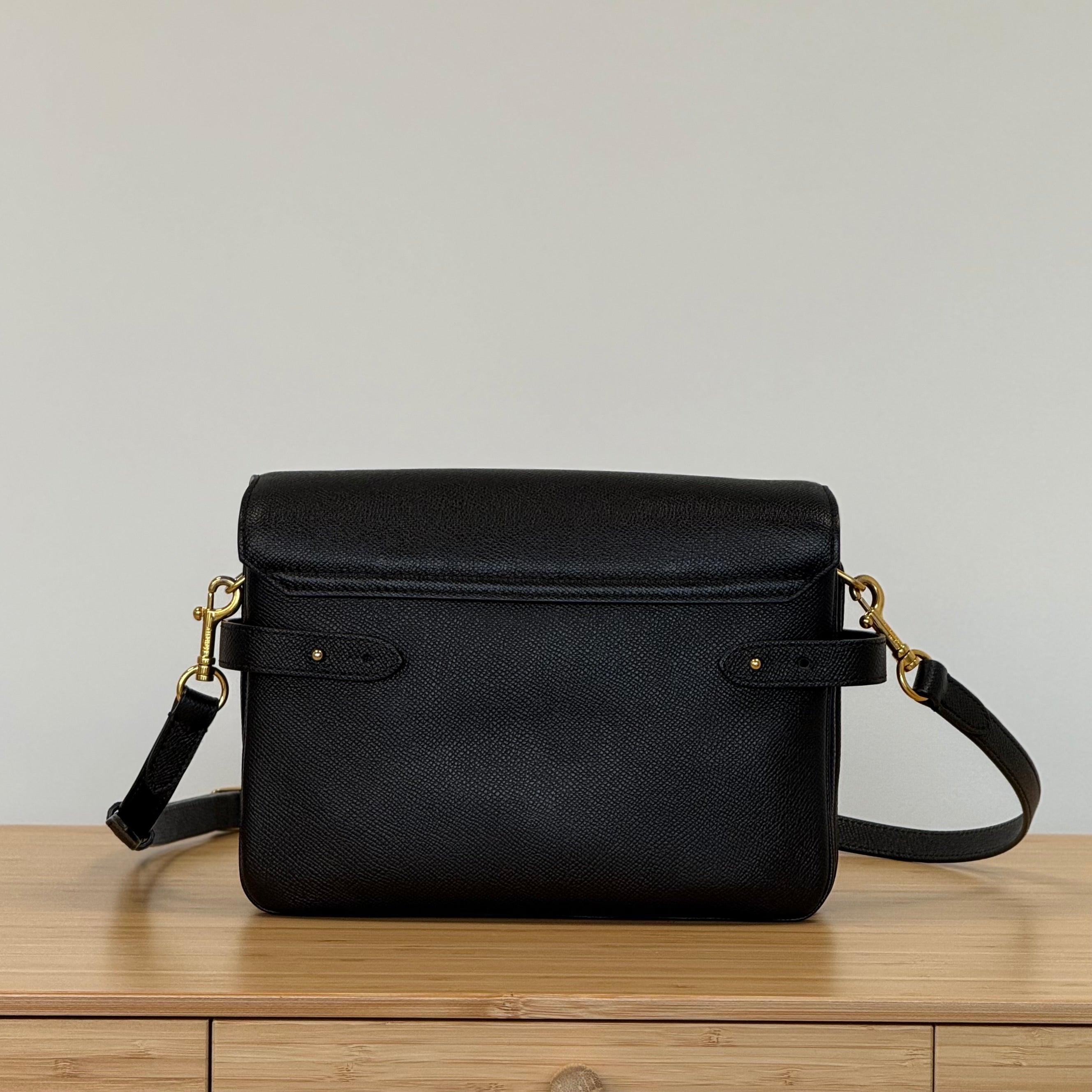 Description: This Mulberry Belted Bayswater Satchel has a removable & adjustable strap. It has a flap closure with a magnetic fasten, and a feature belt with a mini Mulberry Postman’s lock. Inside there are 3 compartments and the central compartment has a zip-top closure.