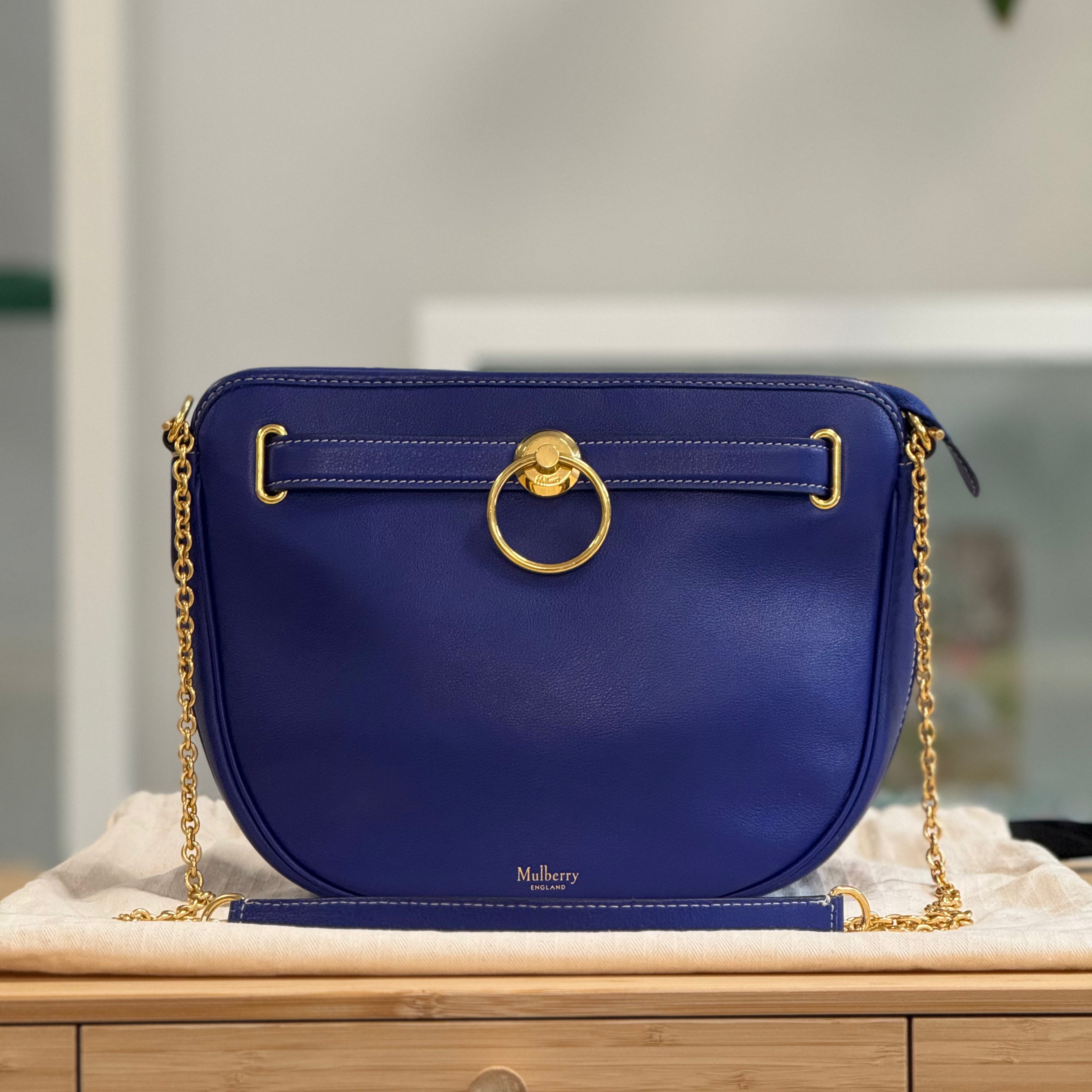Description: This Mulberry Brockwell has a removable leather and chain strap. It has a zip-top closure. Inside there is 1 flat pocket.