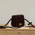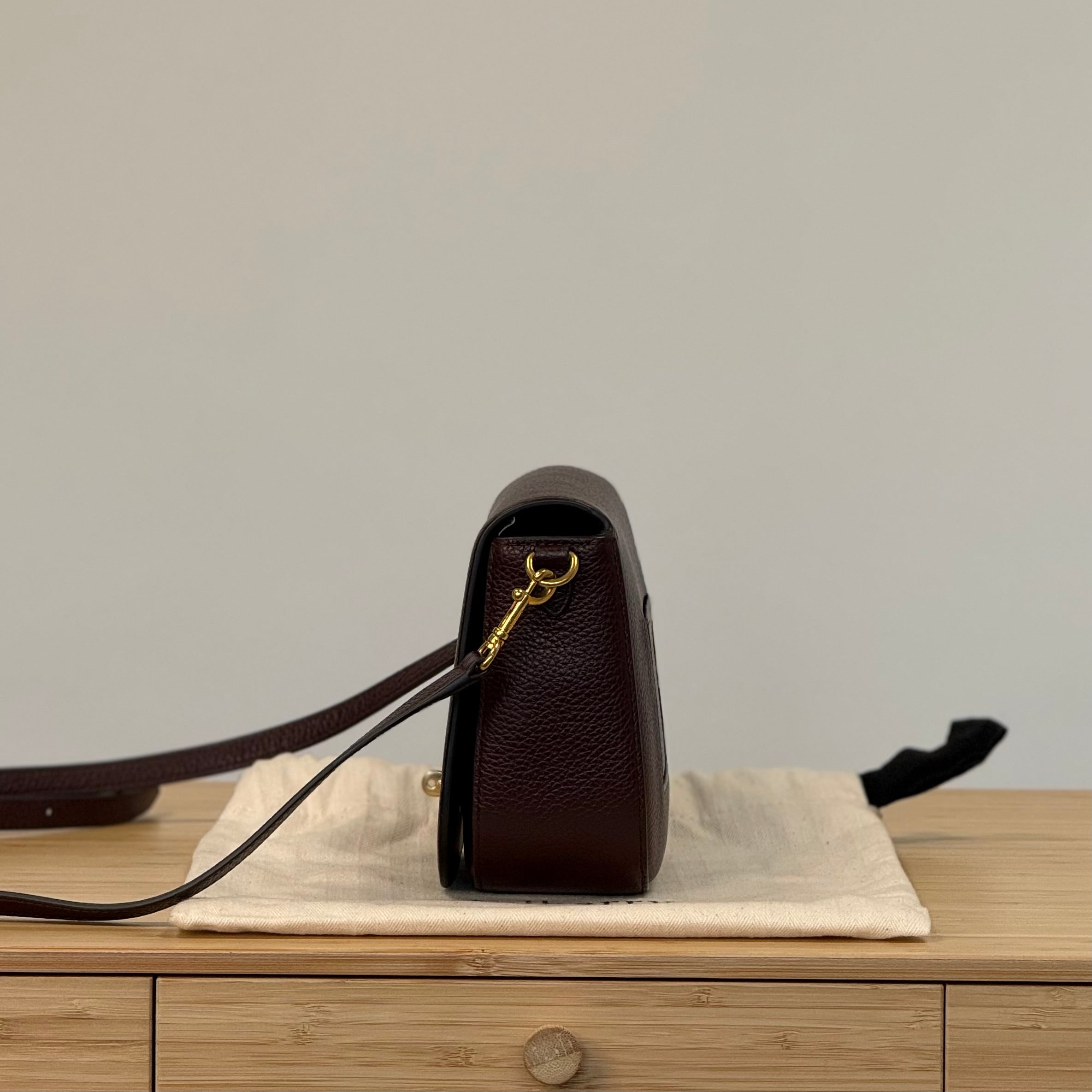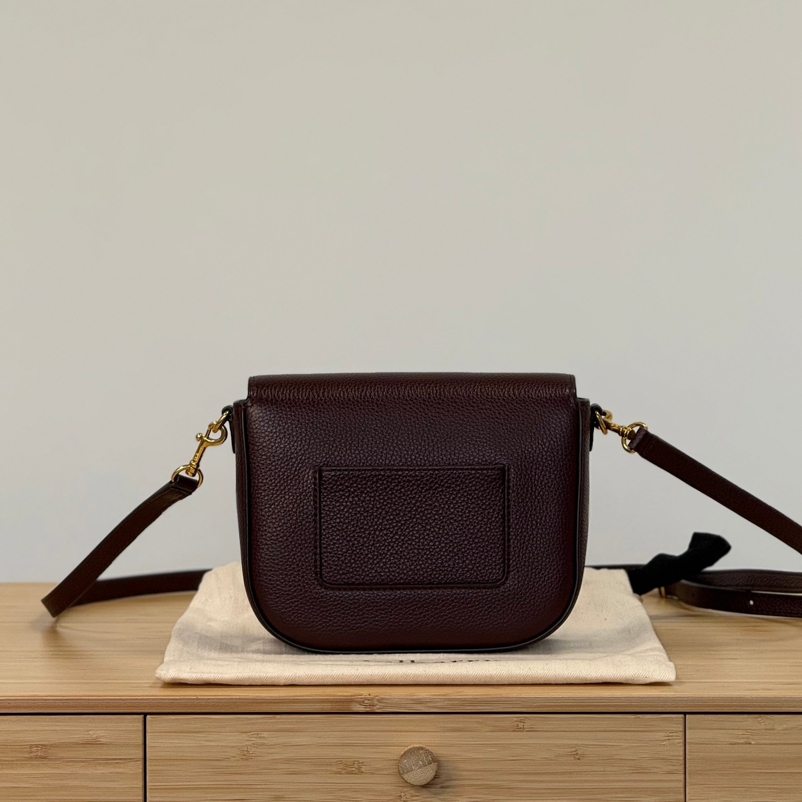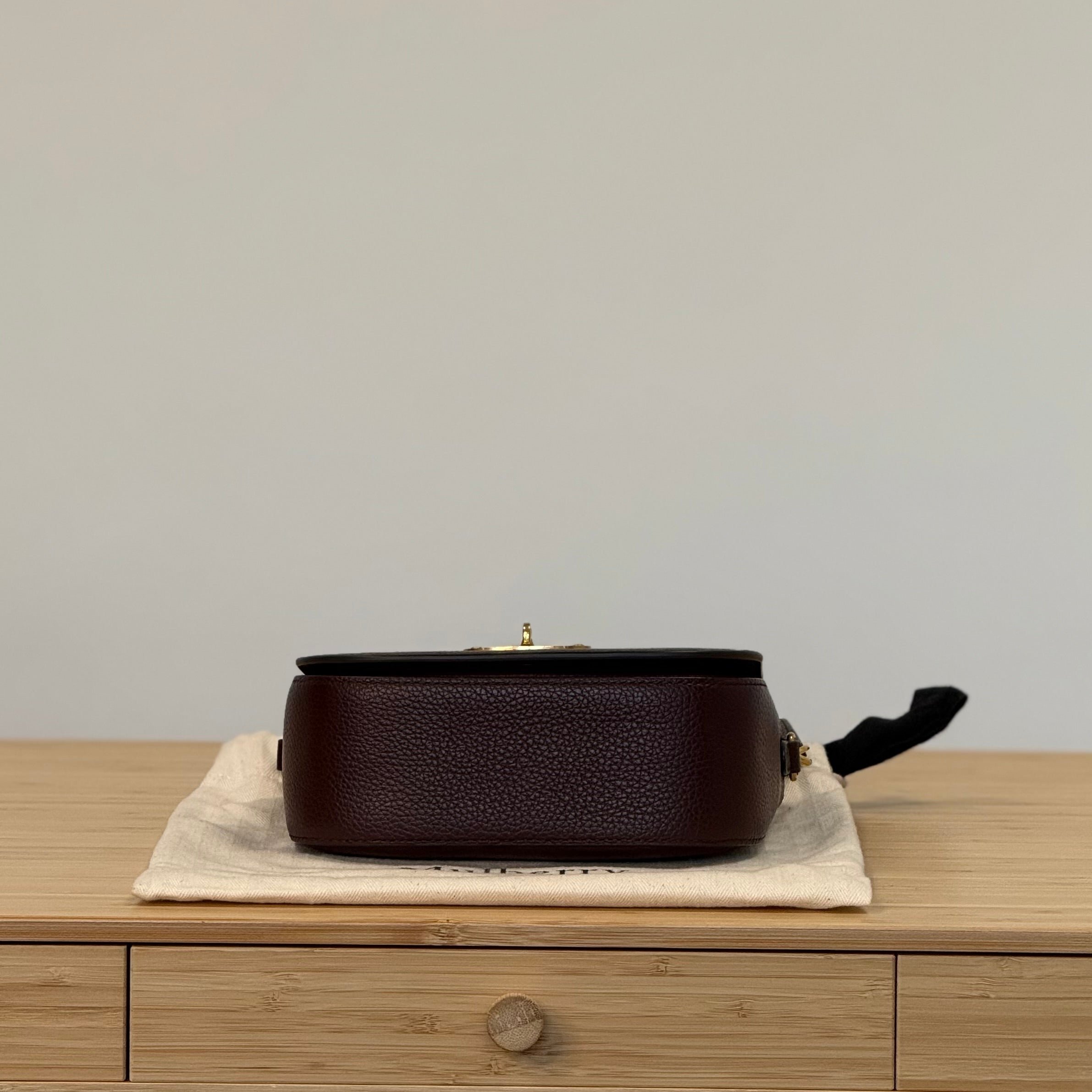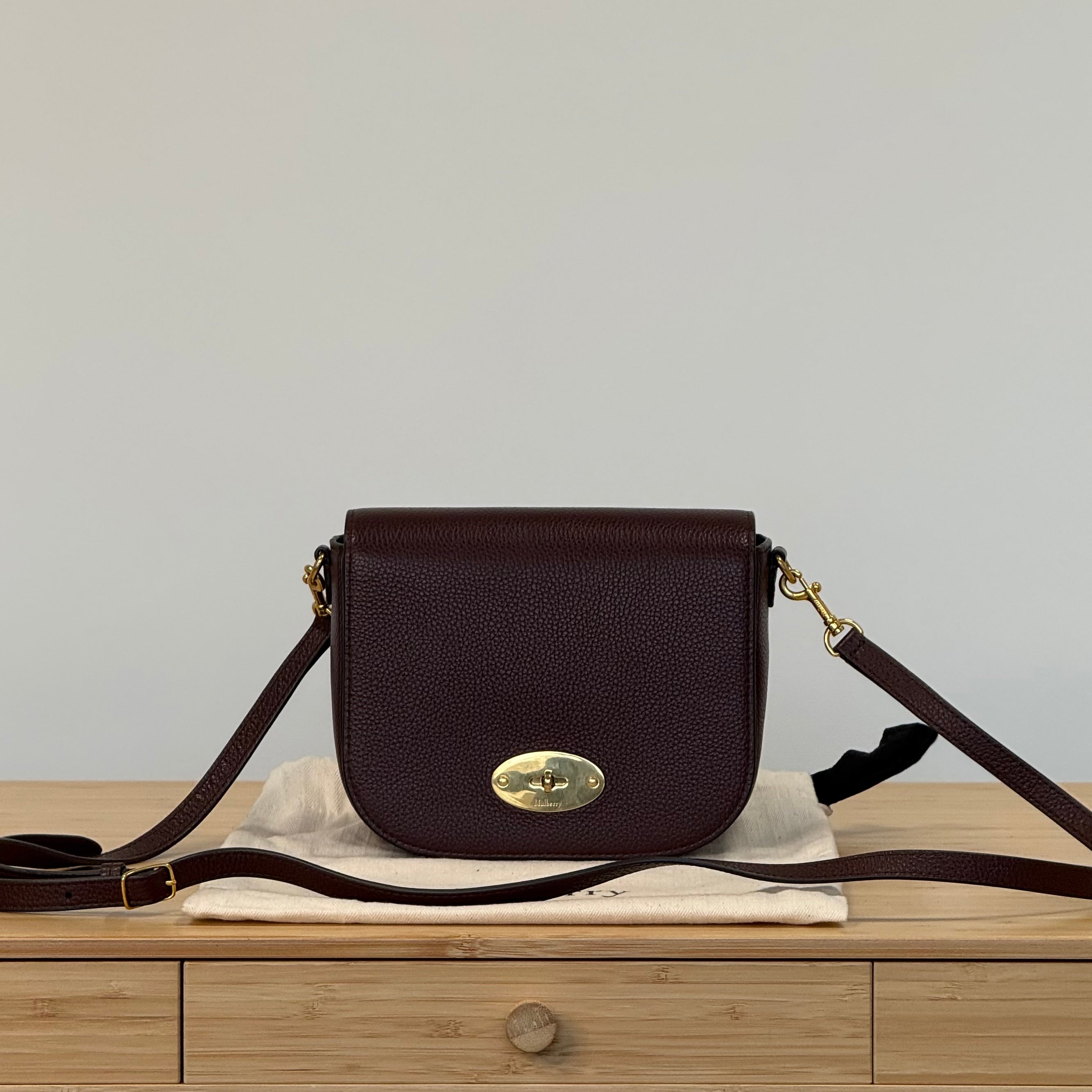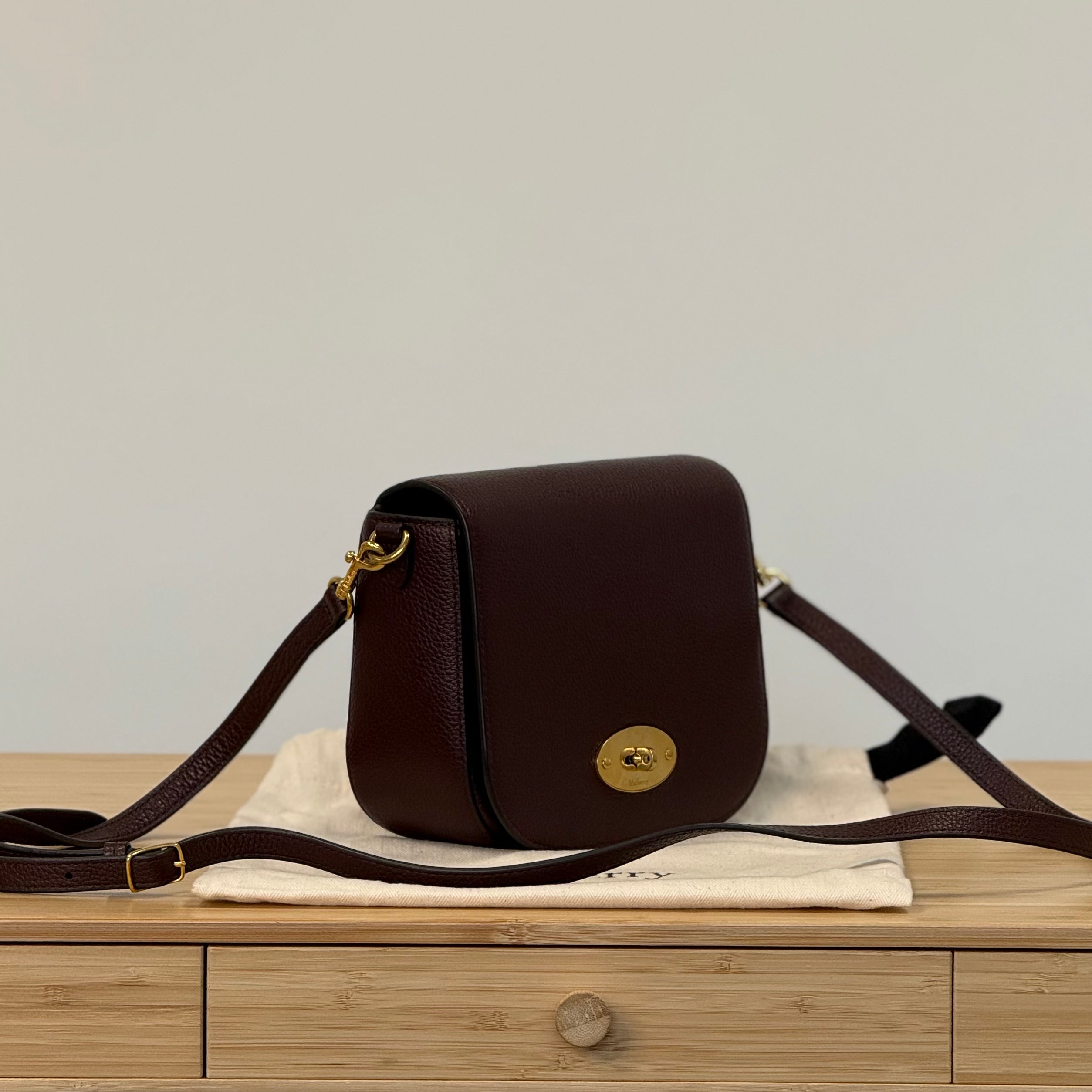 Description: This Mulberry Darley Satchel has an external flat pocket on the back. It has a flap closure with postman’s lock fasten. Inside it has 3 card slots.