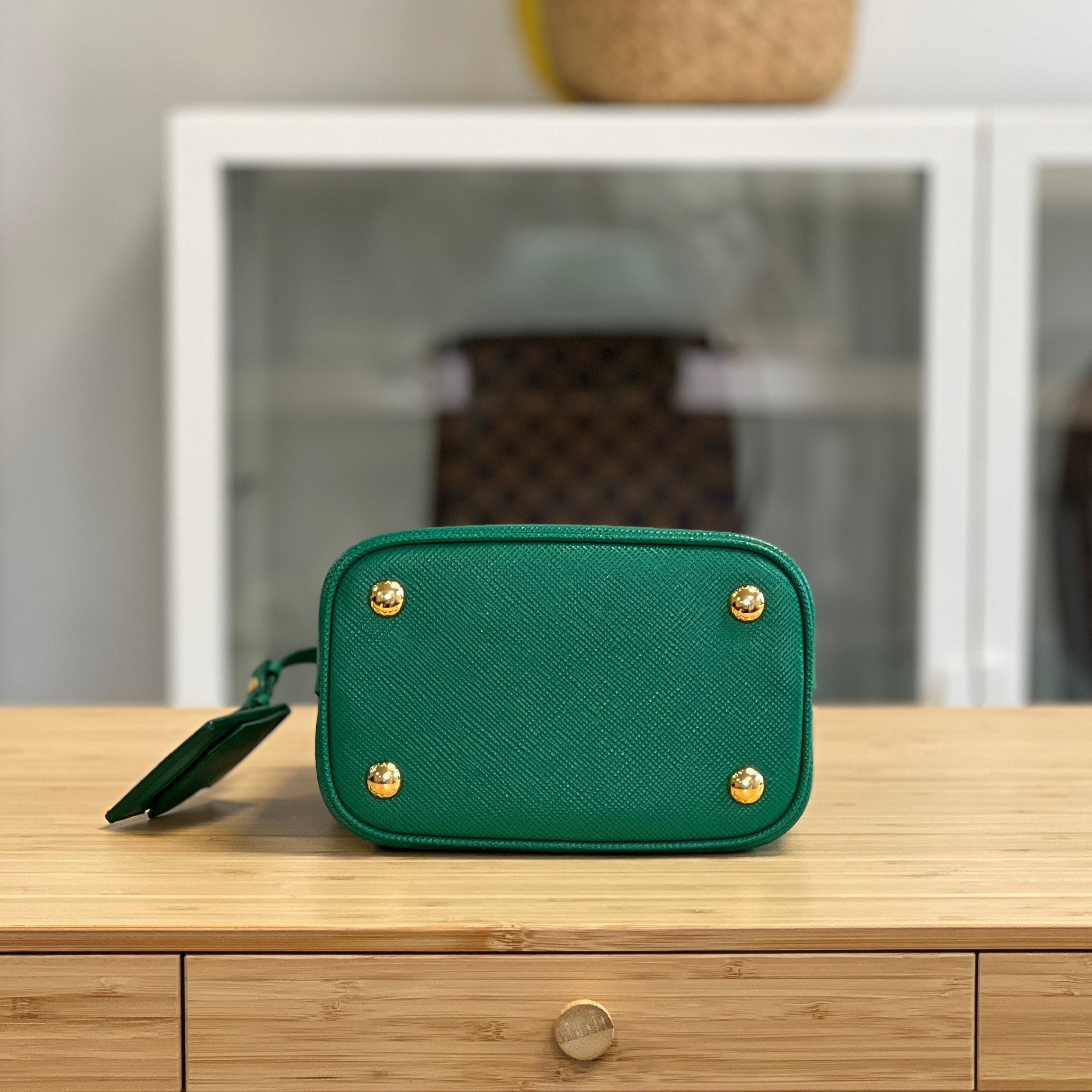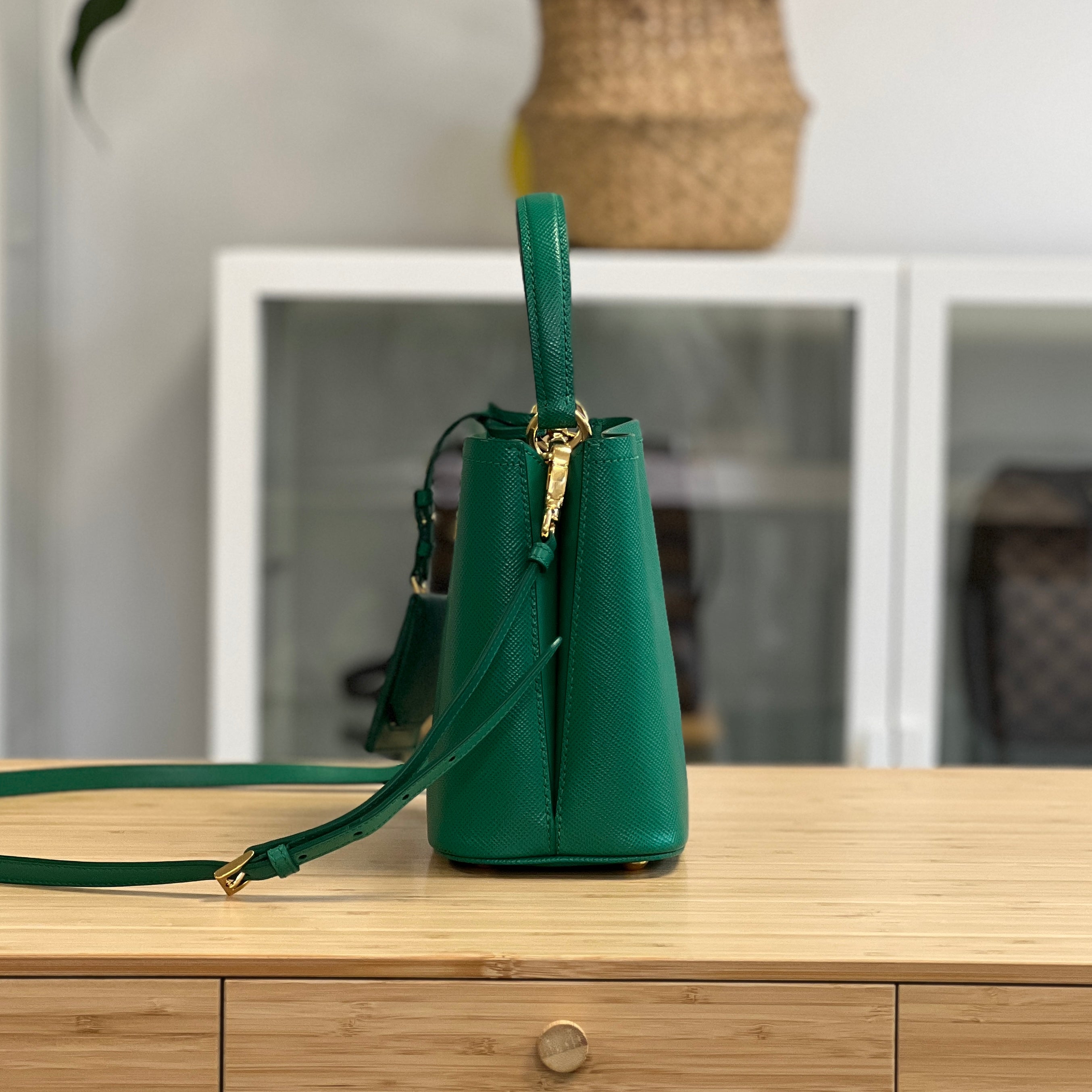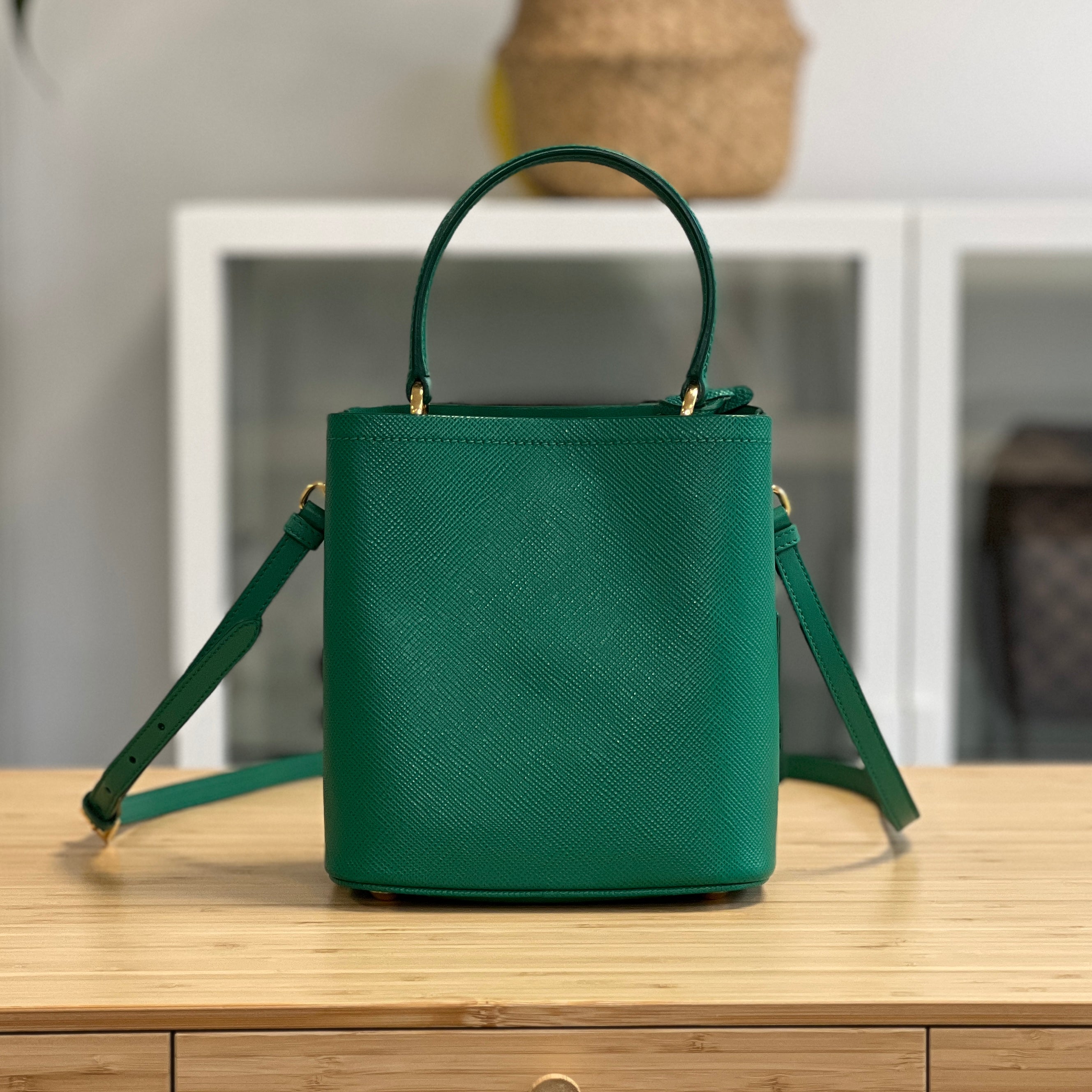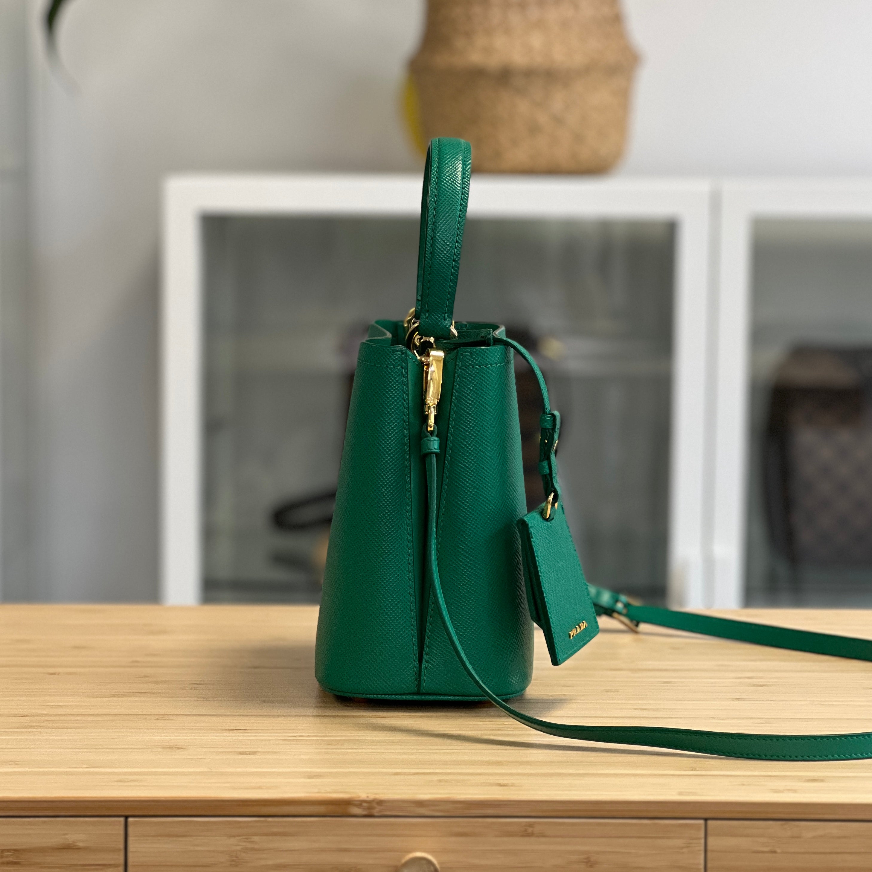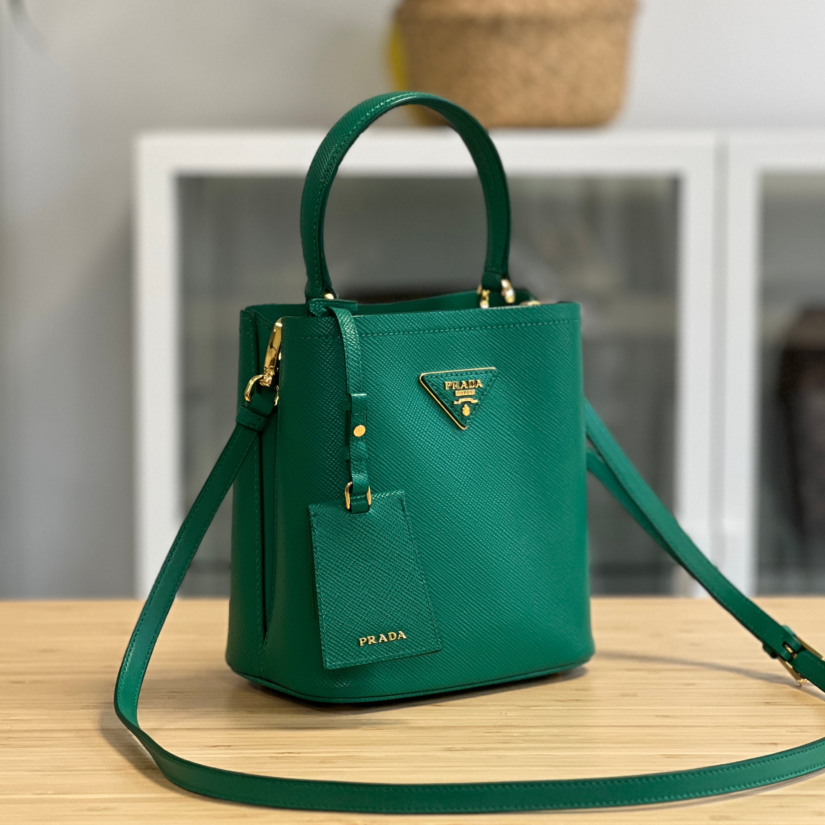 Description: This Prada Panier has a top handle and removable & adjustable crossbody strap. Inside there are 2 compartments, divided by a flat pocket in the centre.