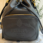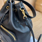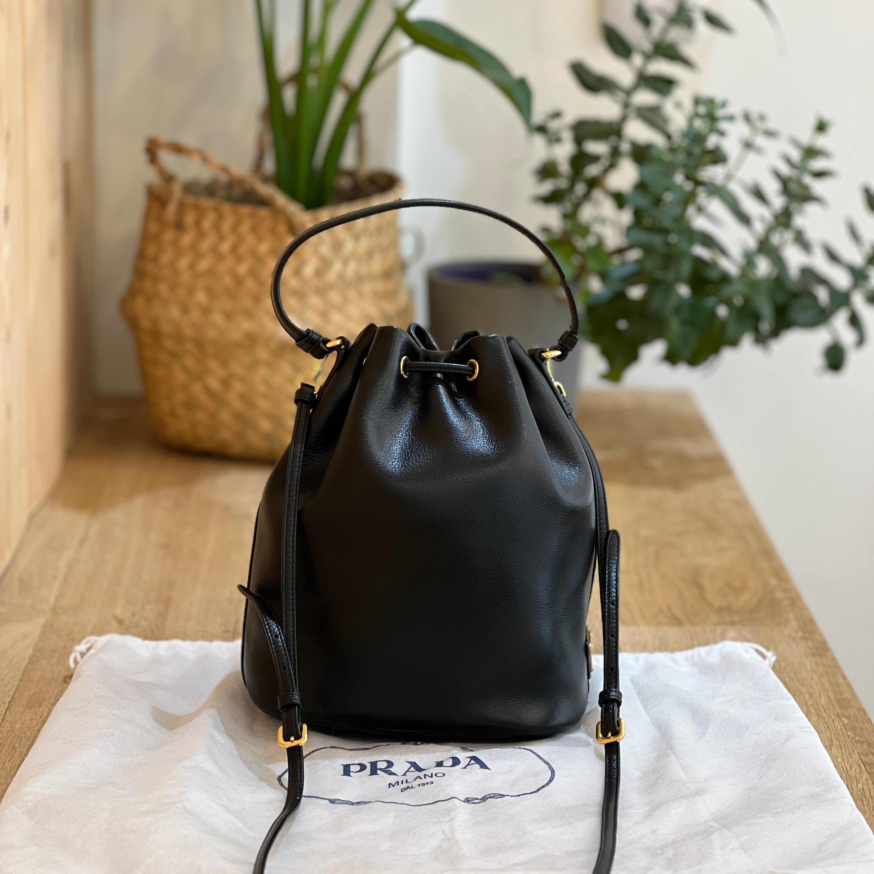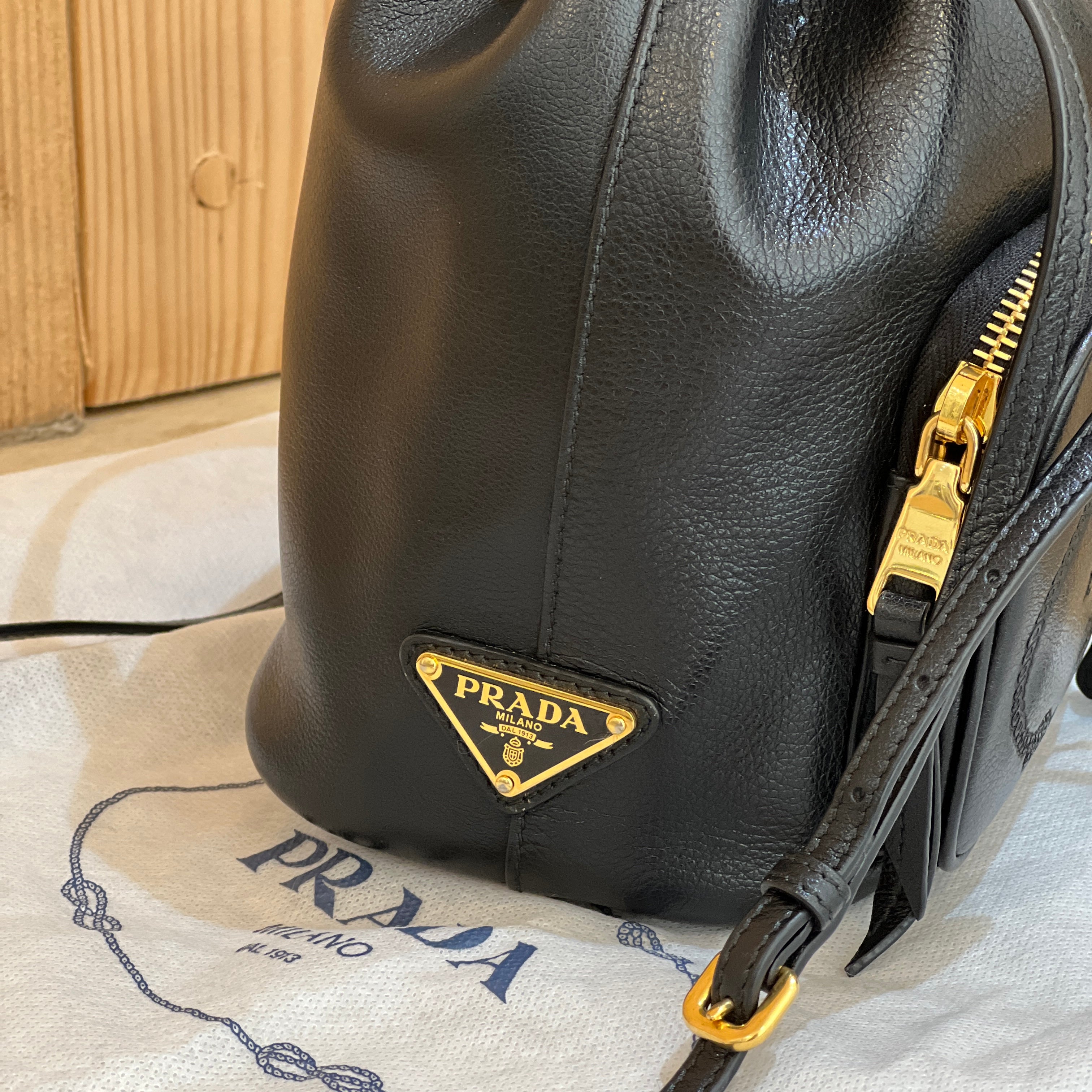 Description: This Prada Secchiello Bucket bag has 1 top handle and 1 removable & adjustable strap. It has a drawstring top closure. On the front it has 1 zipped pocket. Inside it has 1 large open space.