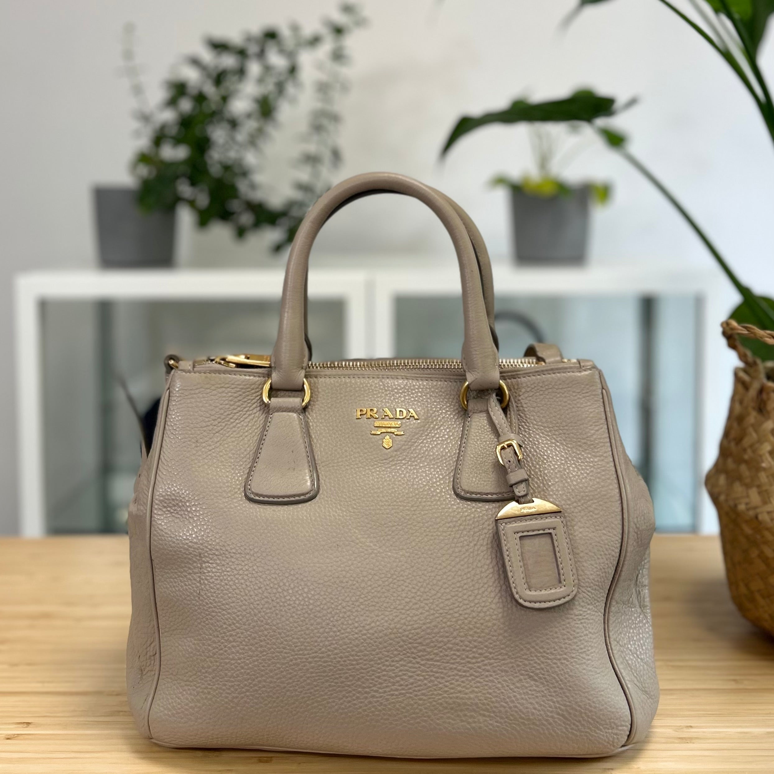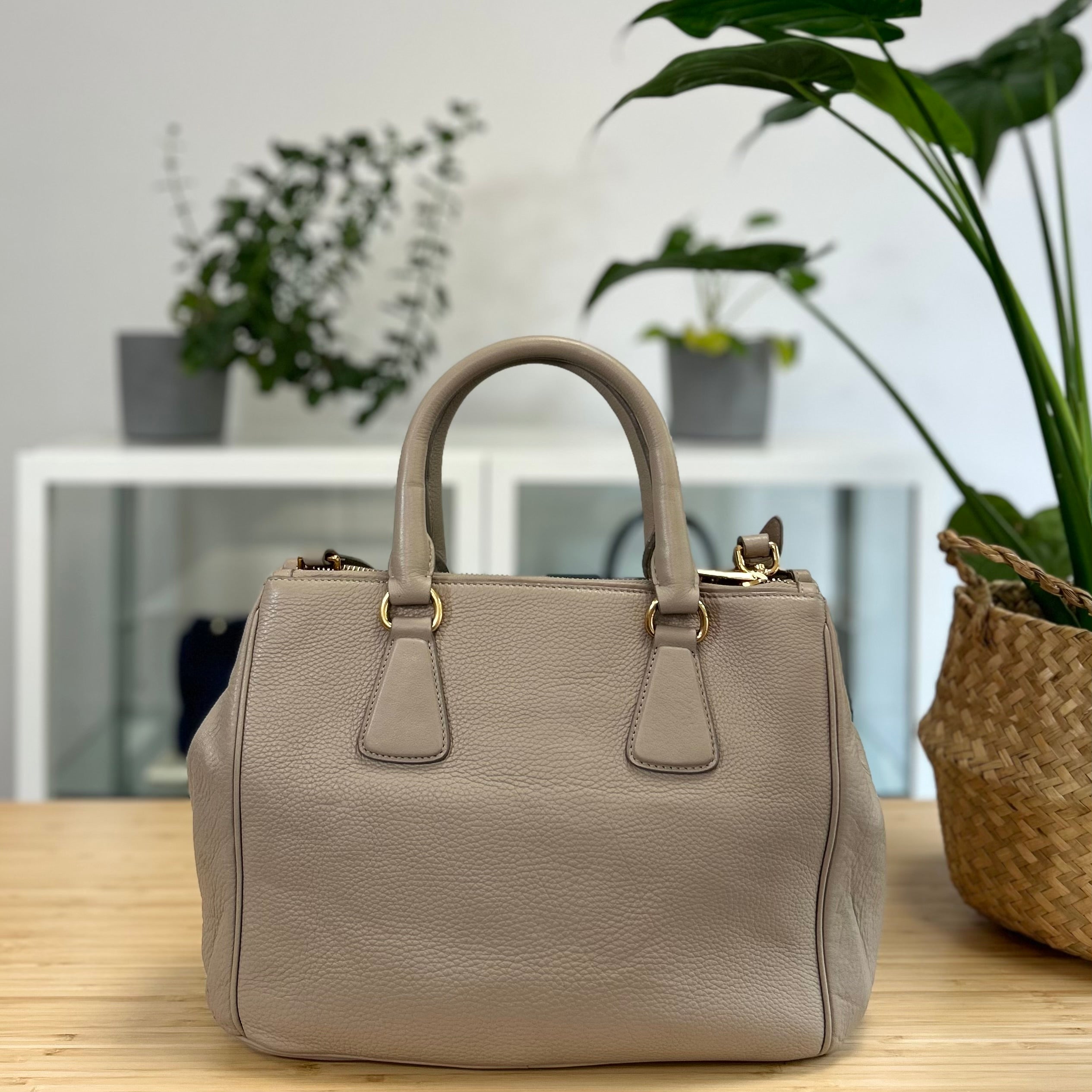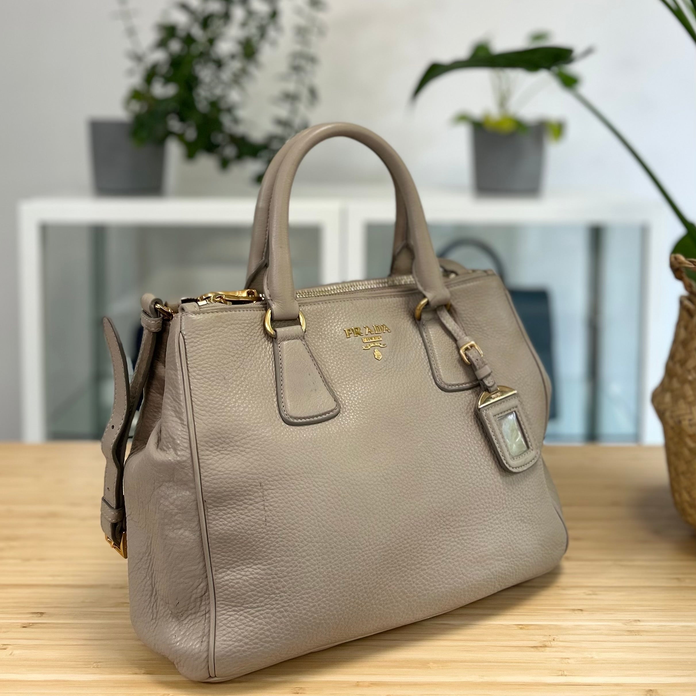 Description: This Prada Daino Tote has double top handles, and a removable & adjustable strap. It has 4 base studs. Inside there are 2 zipped compartments, and 1 central compartment with a press-stud fasten. In the central compartment, there is 1 zipped pocket, and 2 flat pockets.