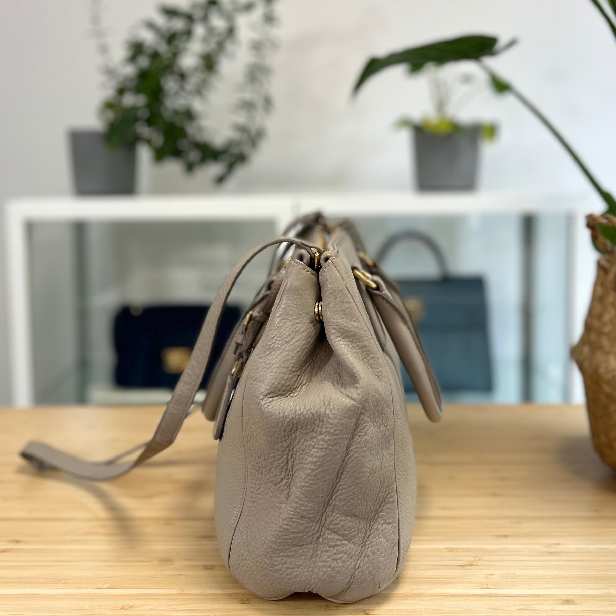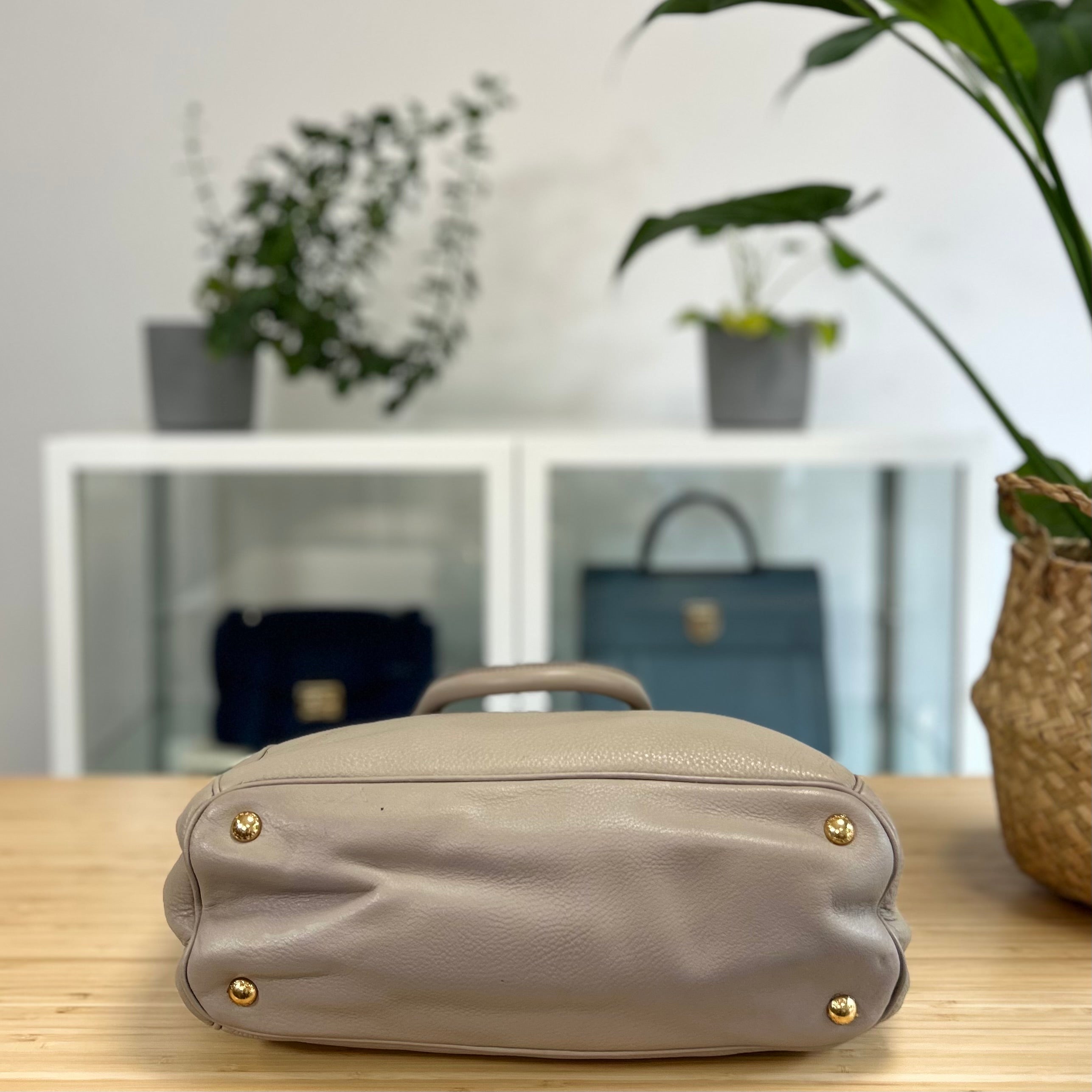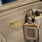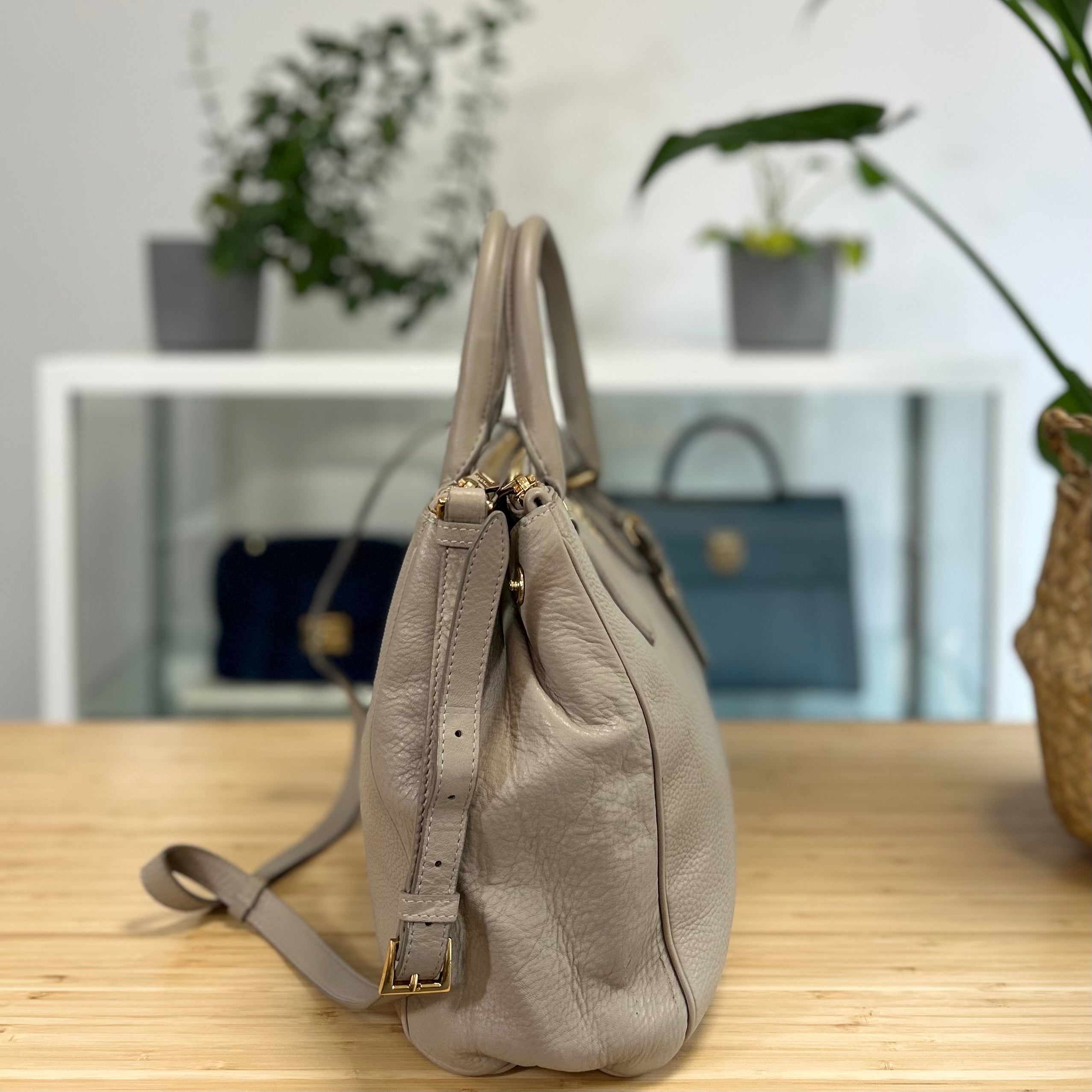 Description: This Prada Daino Tote has double top handles, and a removable & adjustable strap. It has 4 base studs. Inside there are 2 zipped compartments, and 1 central compartment with a press-stud fasten. In the central compartment, there is 1 zipped pocket, and 2 flat pockets.