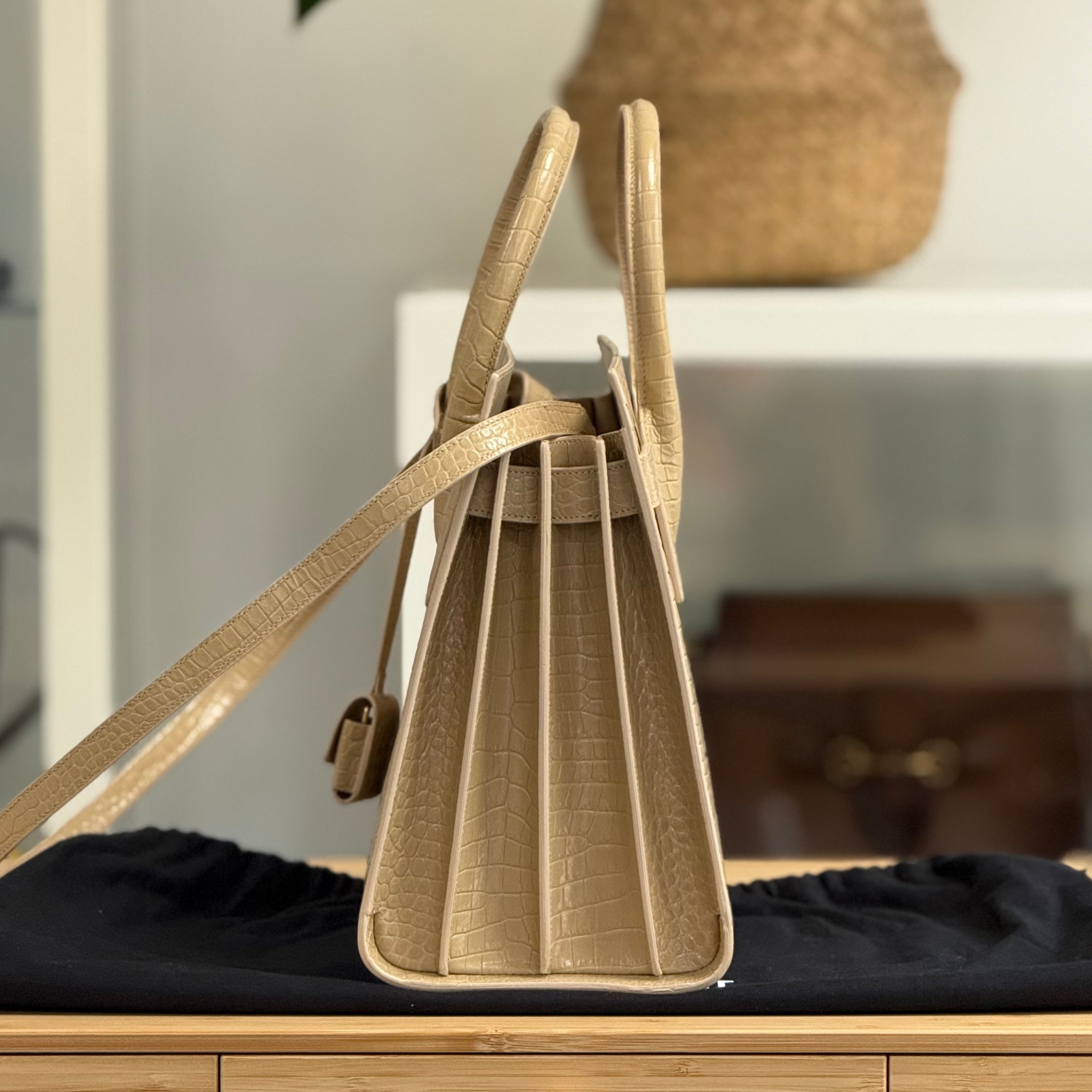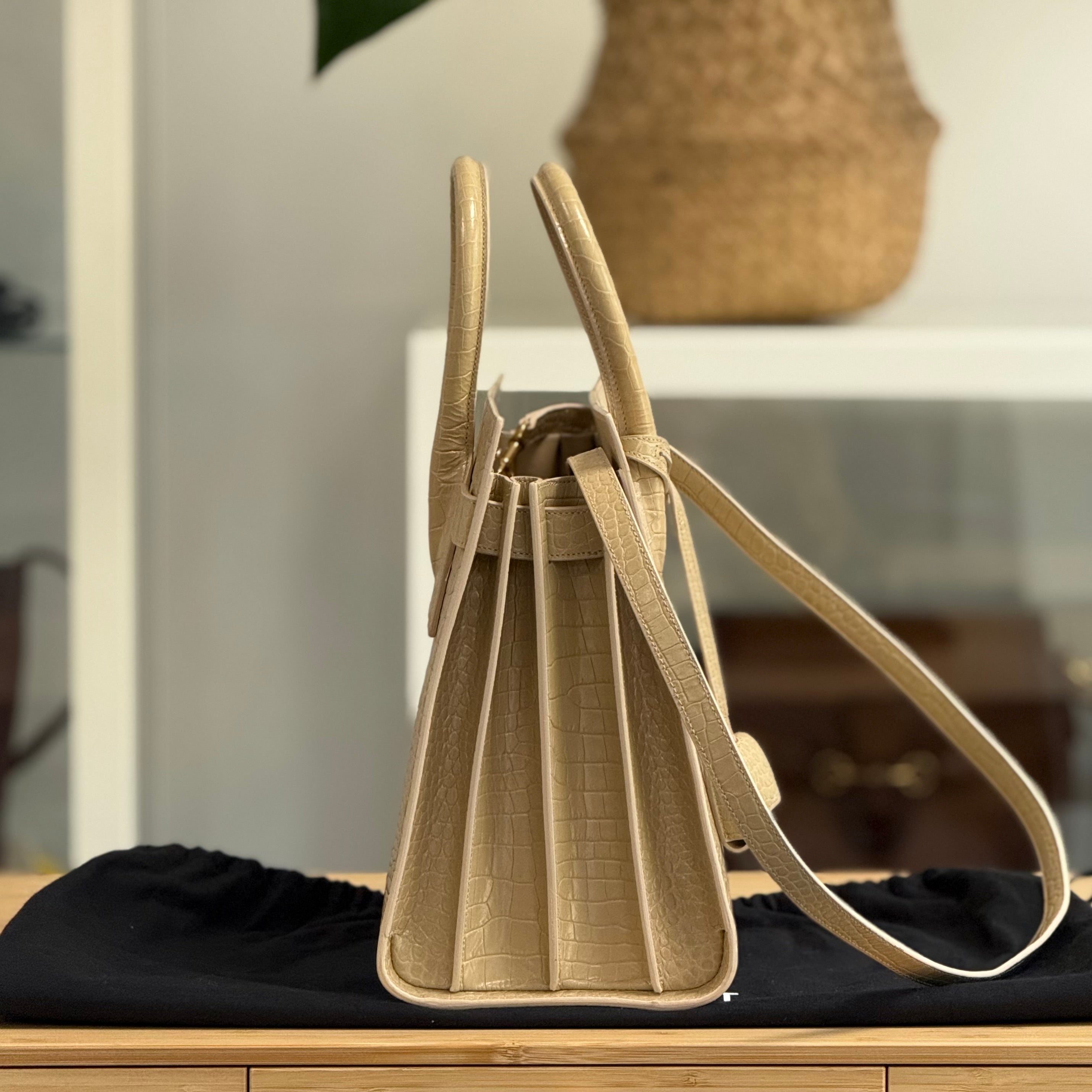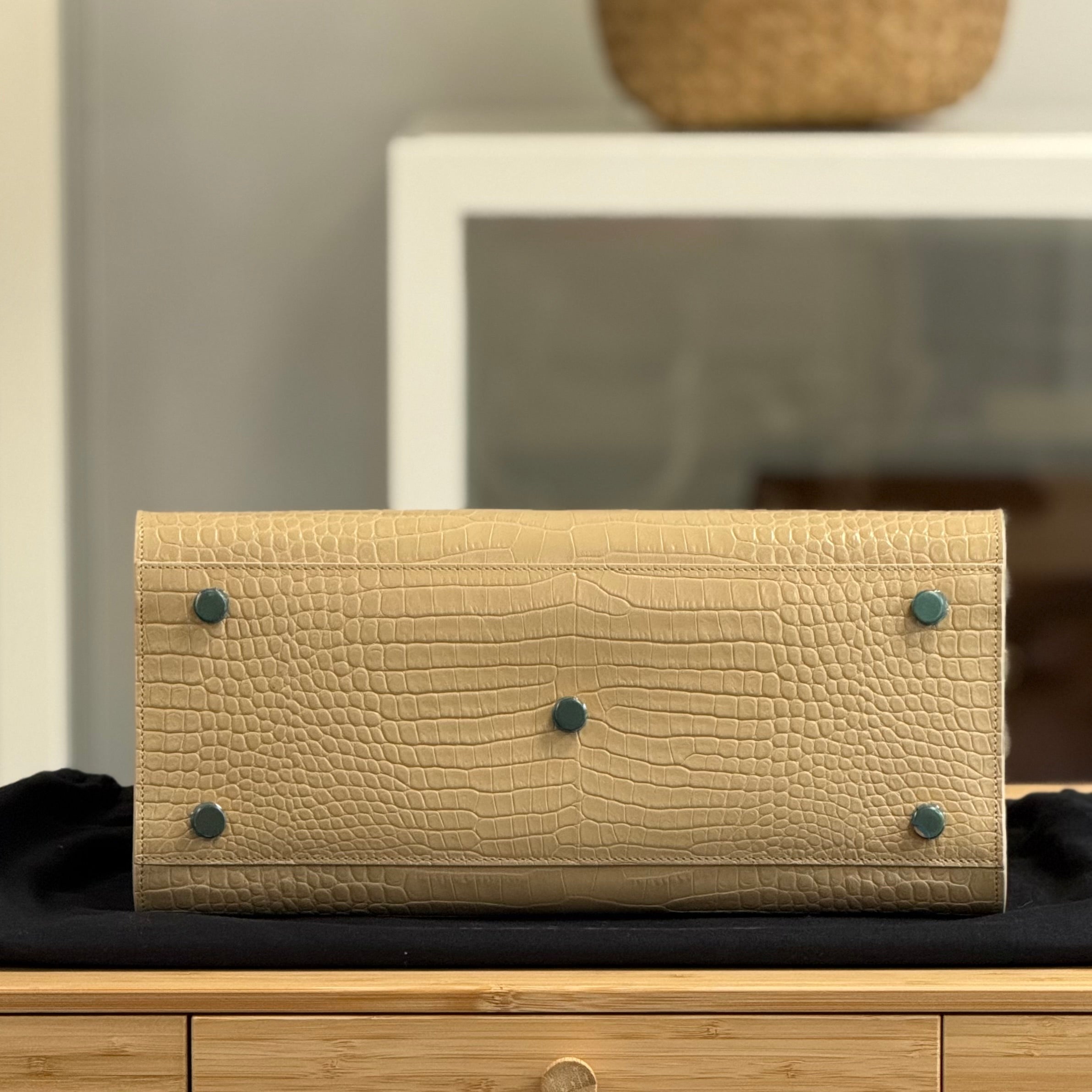 Description: This Saint Laurent Croc Sac de Jour has 2 top handles and a removable strap. It has a removable cloche with padlock. The base has 5 studs. Inside it has 2 large compartments and a central zipped pocket. It has a fob with 2 keys that is attached to the inside with a press-stud.