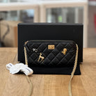 Description: This Chanel Charms Clutch on Chain has two zipped pockets and one middle pocket, and a removable chain. On the interior it has six card pockets. The date code begins 26, so it is from 2018/2019.