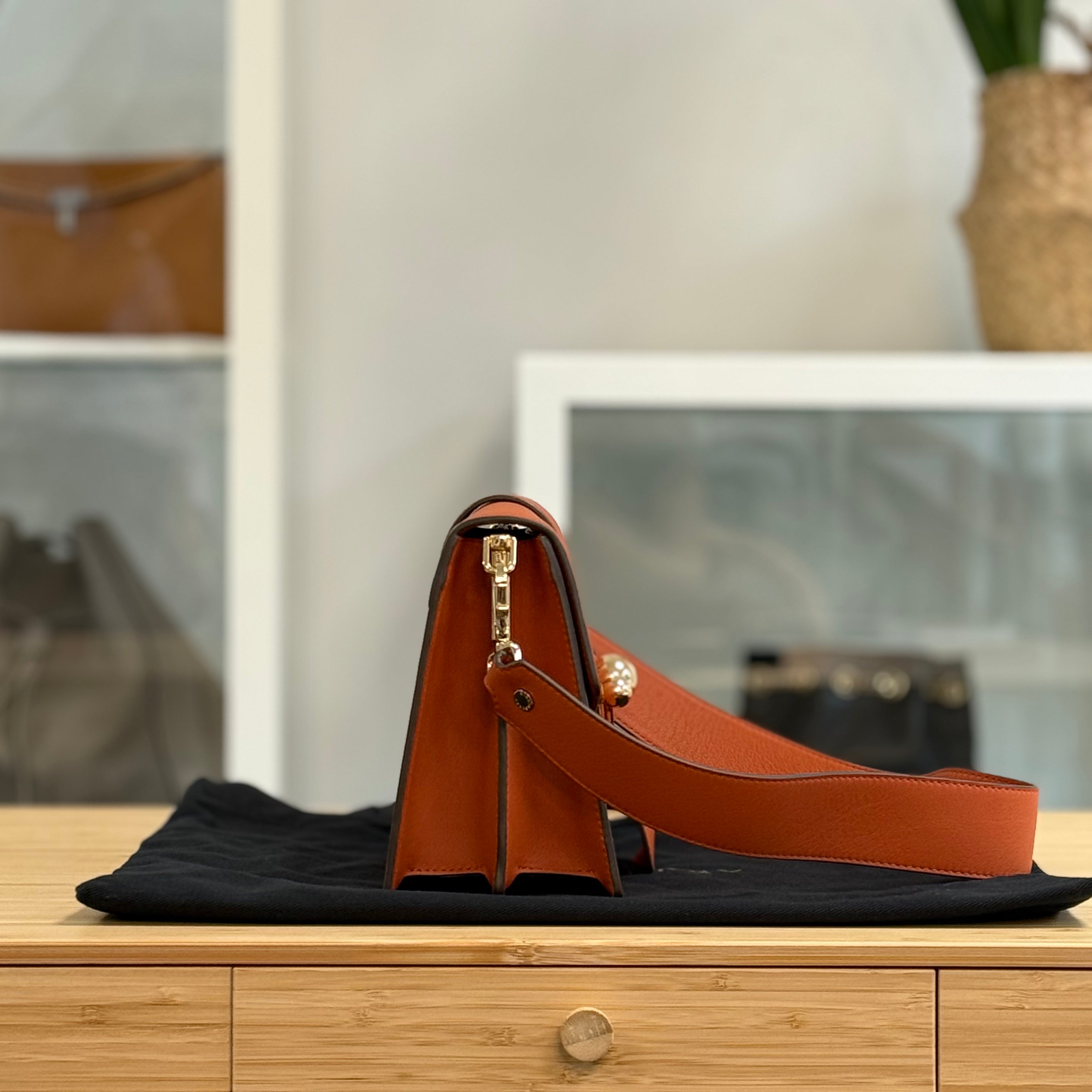 Description: This Strathberry Box Crescent has a removable chain strap and a removable leather strap. It has a flap closure and a magnetic fasten. Inside there is one flat pocket.