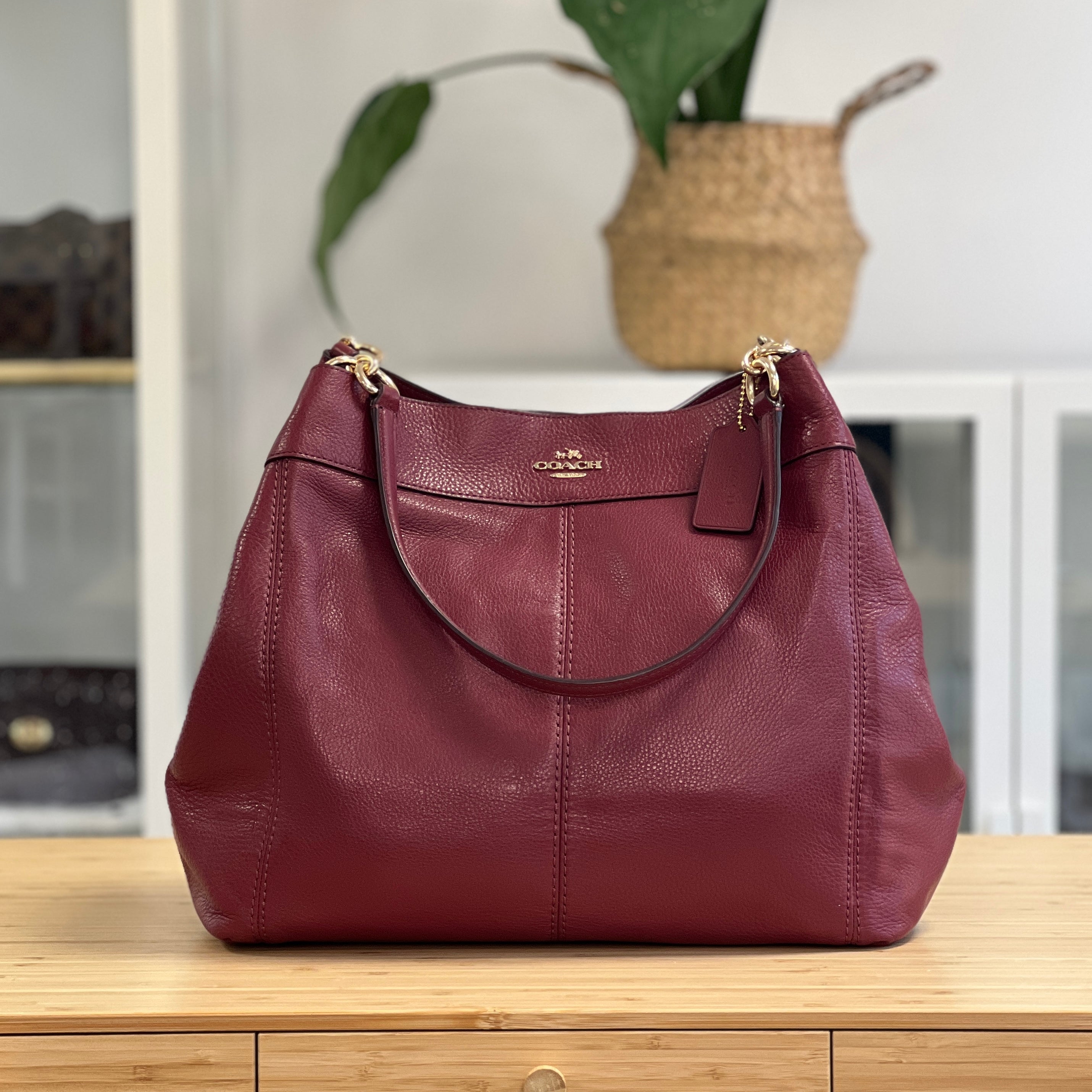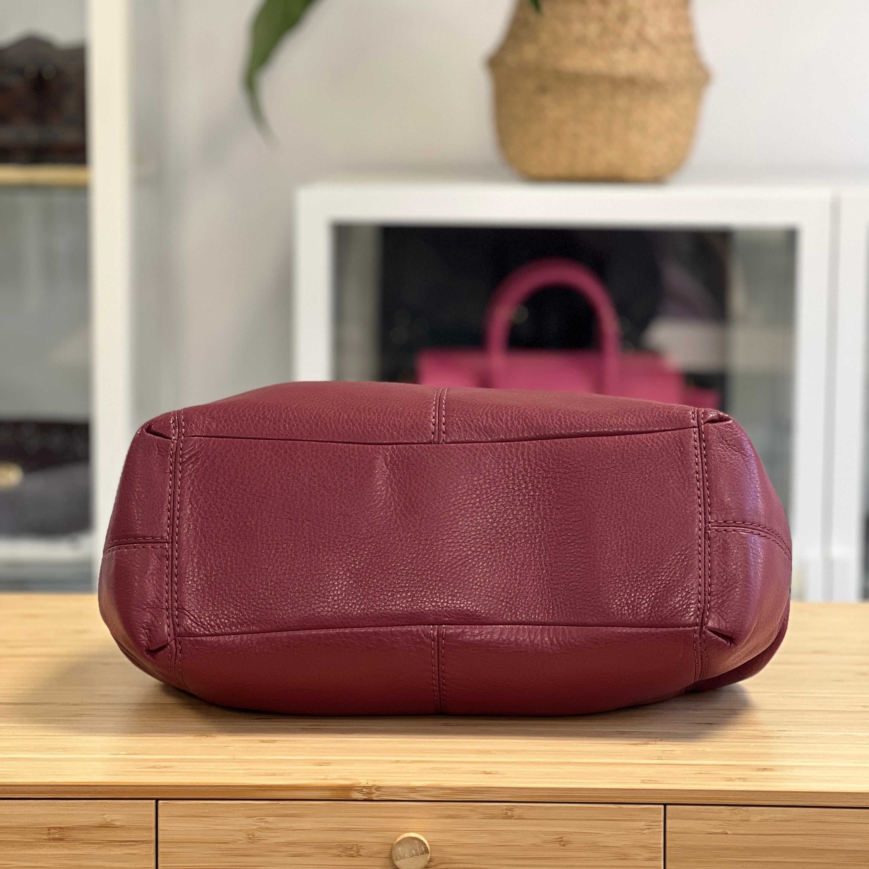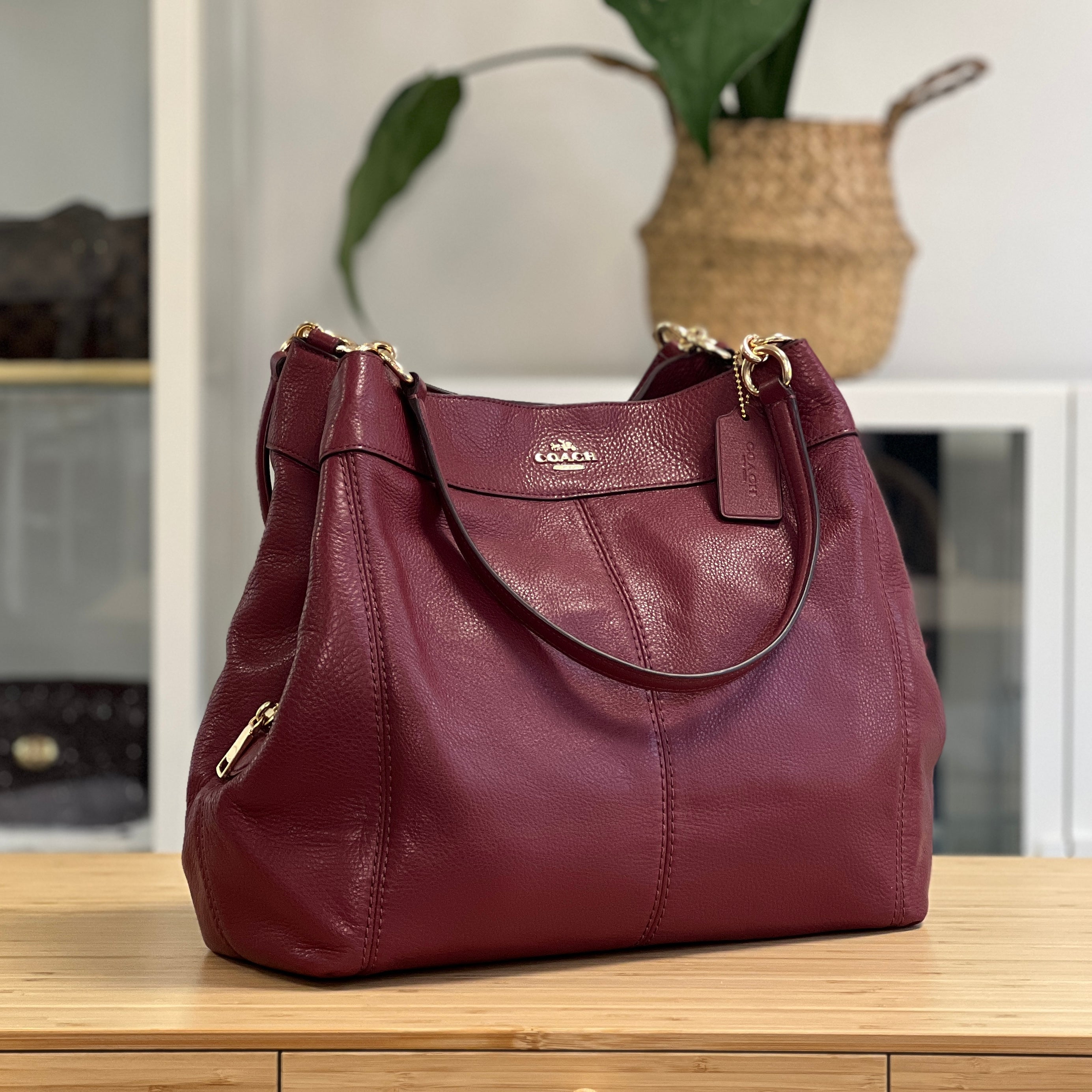 Description: This Coach Lexy has two top handles. It has a press-stud closure. It has three compartments: The front one has 2 flat pockets, the central one has a zip top closure, the back one has 1 zipped pocket.