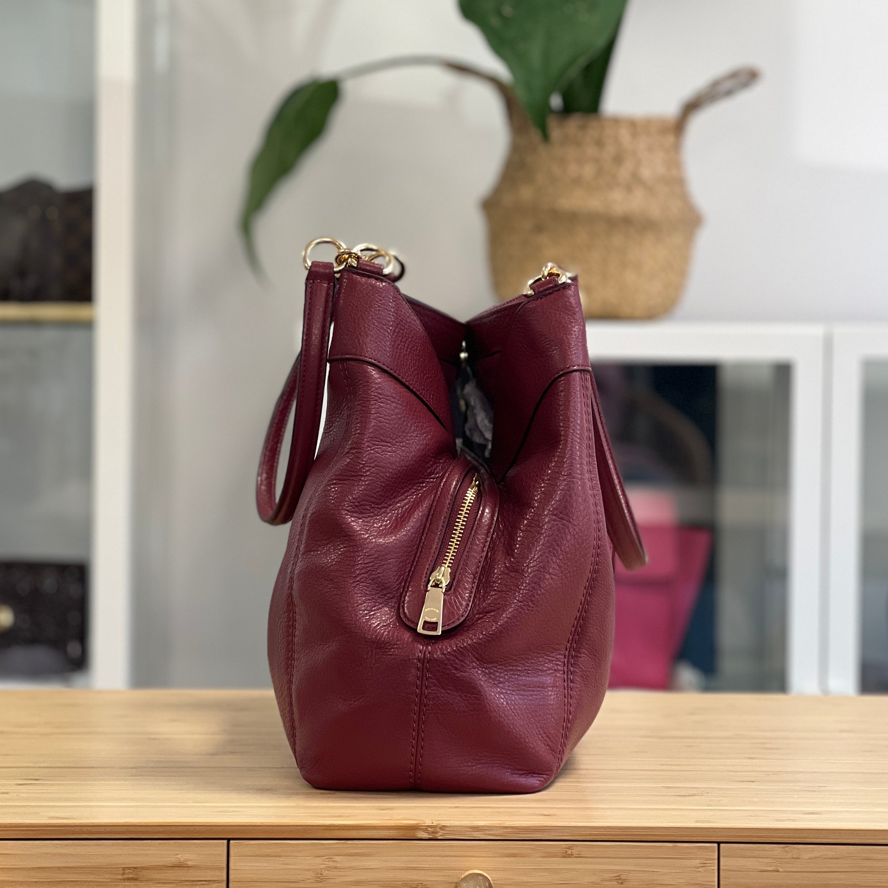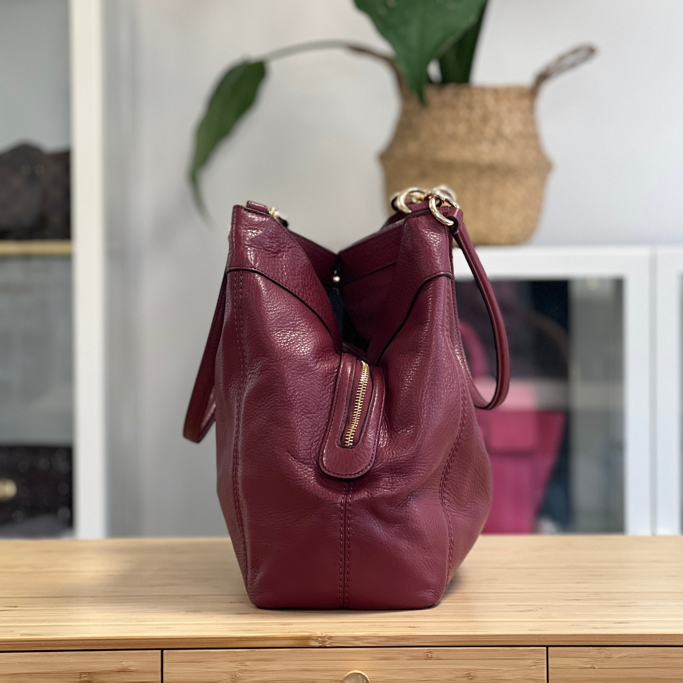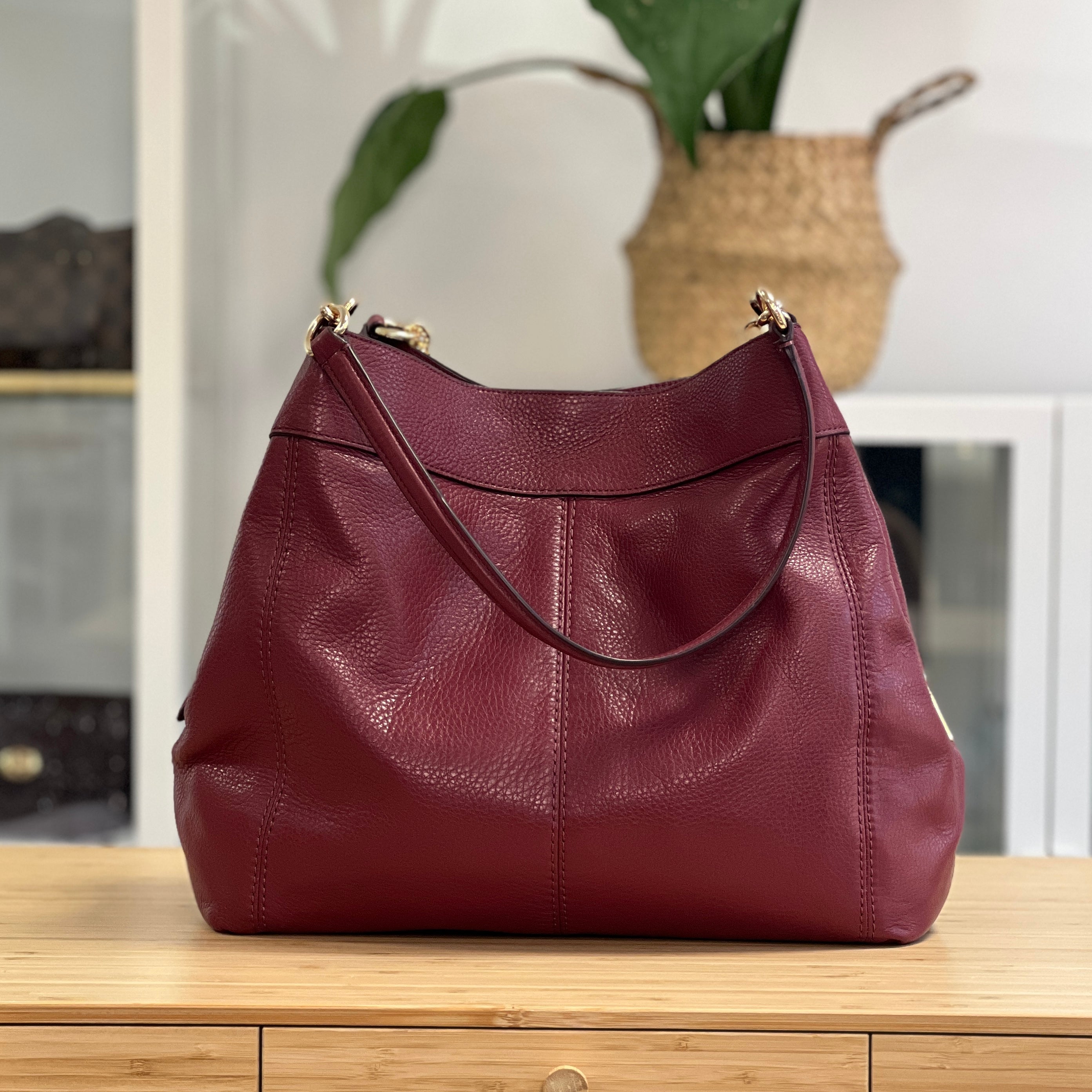 Description: This Coach Lexy has two top handles. It has a press-stud closure. It has three compartments: The front one has 2 flat pockets, the central one has a zip top closure, the back one has 1 zipped pocket.