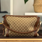 Description: This Gucci Bella Hobo has a braided top handle. There is a braided tassel bow feature on the side of the bag. It has 5 base studs. It has a zip top closure. Inside there is one main compartment, 1 zipped pocket, and 2 open pockets.