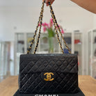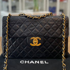 Description: This Chanel Vintage Maxi Single Flap has an adjustable strap, and a flap closure with CC turn-lock. It has 1 exterior back flat pocket. Inside there is 1 flat pocket and 1 zipped pocket. The date code begins 3 so it is from 1994-96.