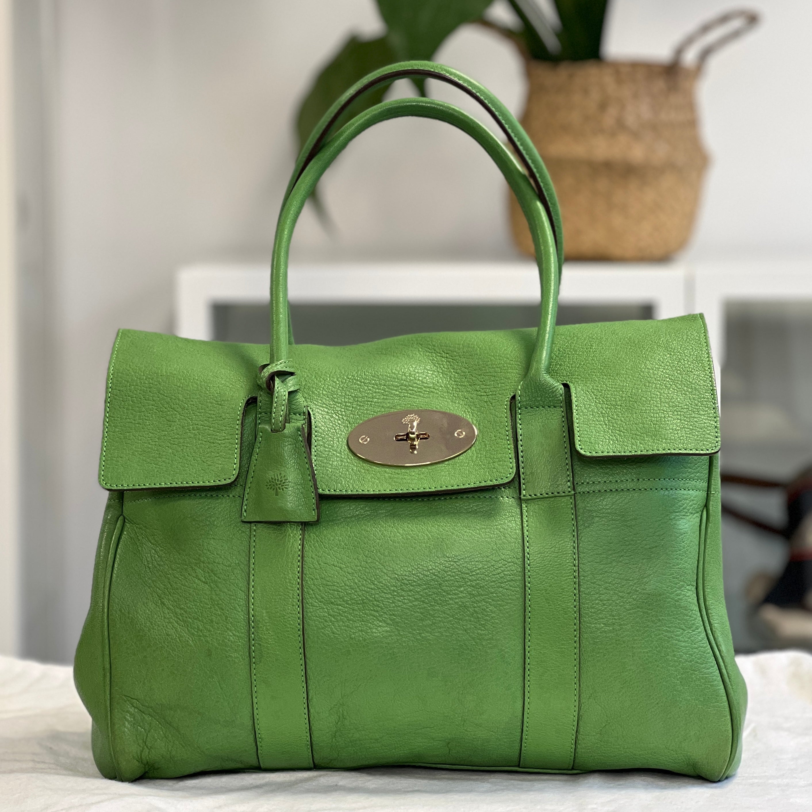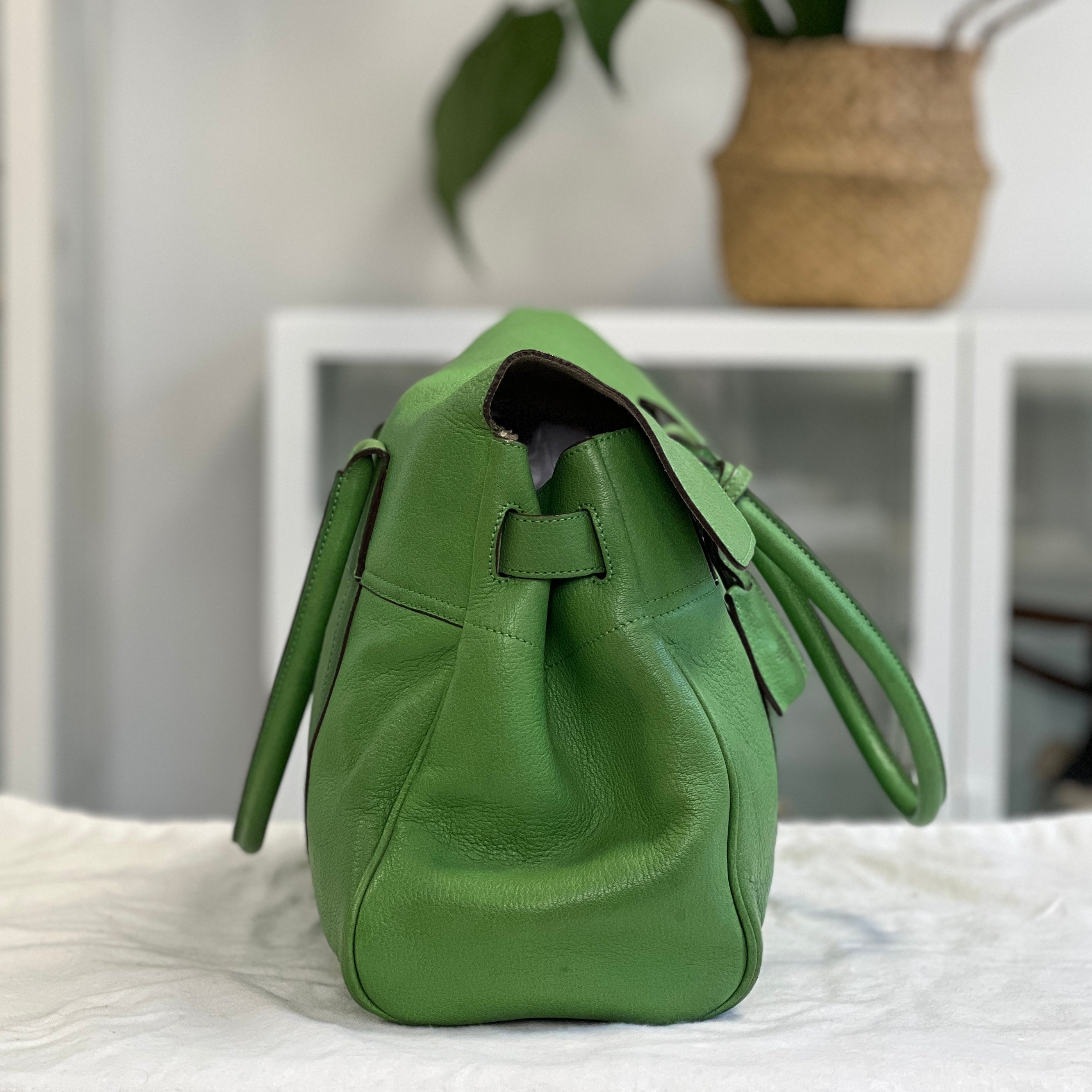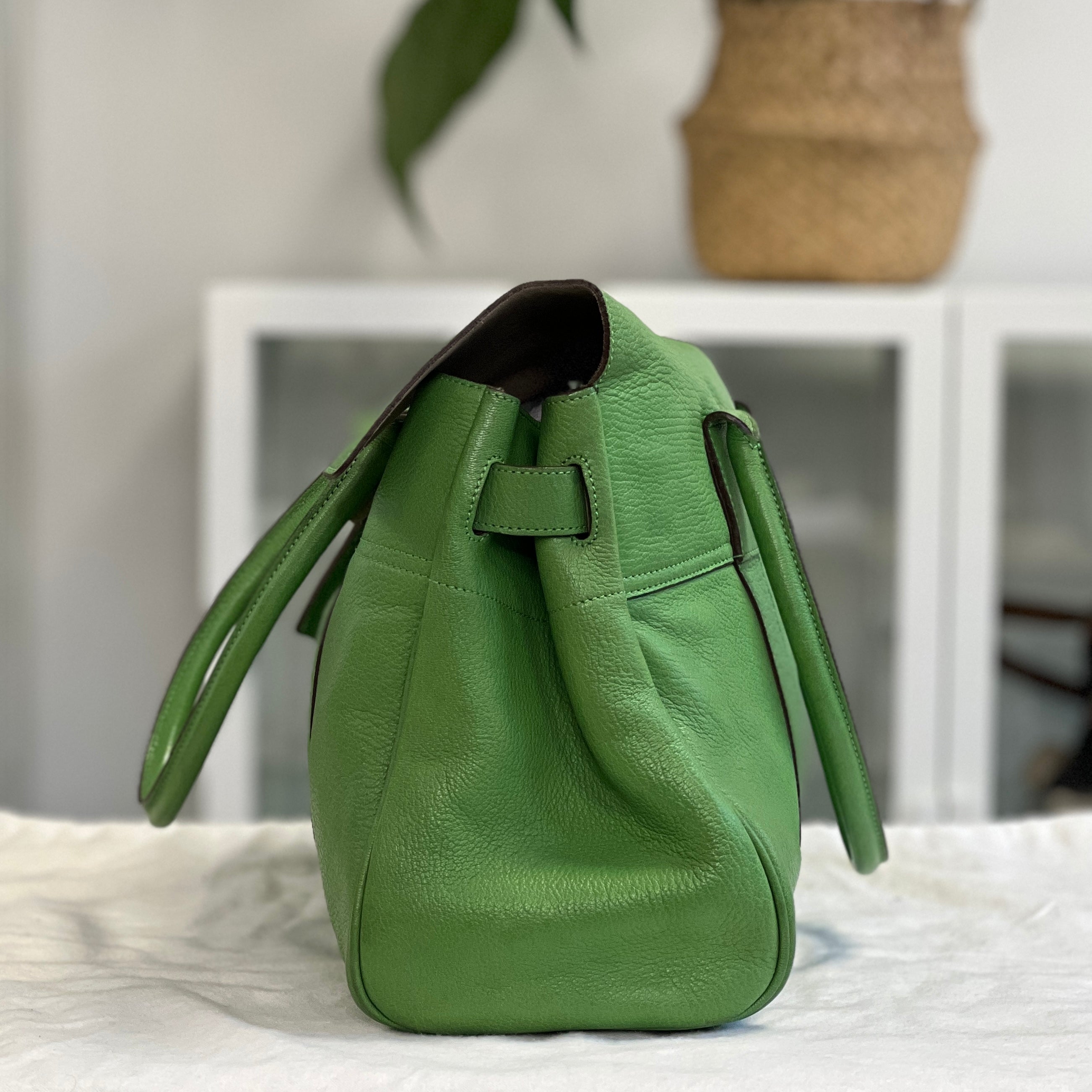 Description: This Mulberry Bayswater has double top handles with a Mulberry cloche and padlock. It has 4 base studs. It has a flap closure with a Mulberry postman’s lock. Inside there are 2 flat pockets and 1 zipped pocket. It has 2 interior buckles to adjust the side gussets.