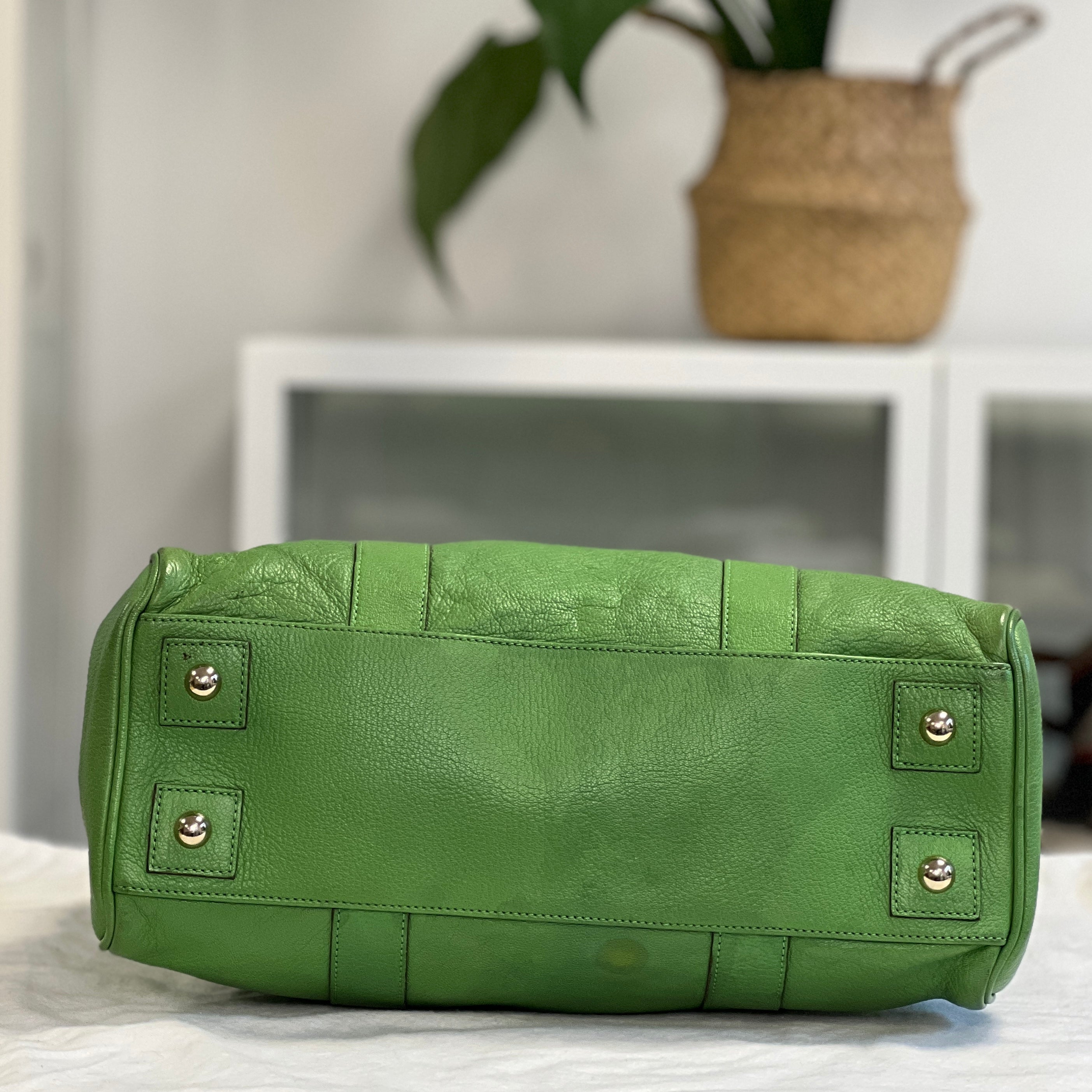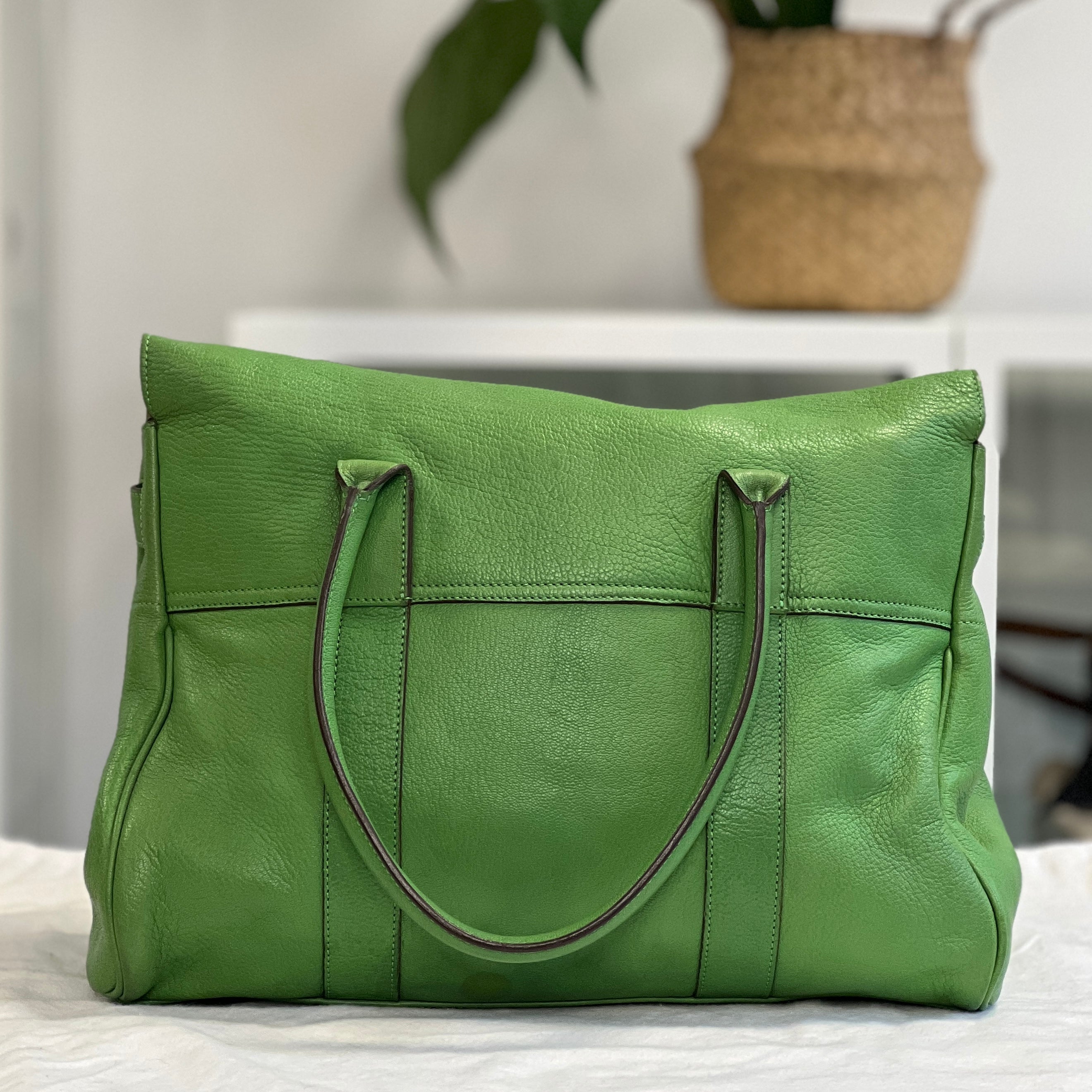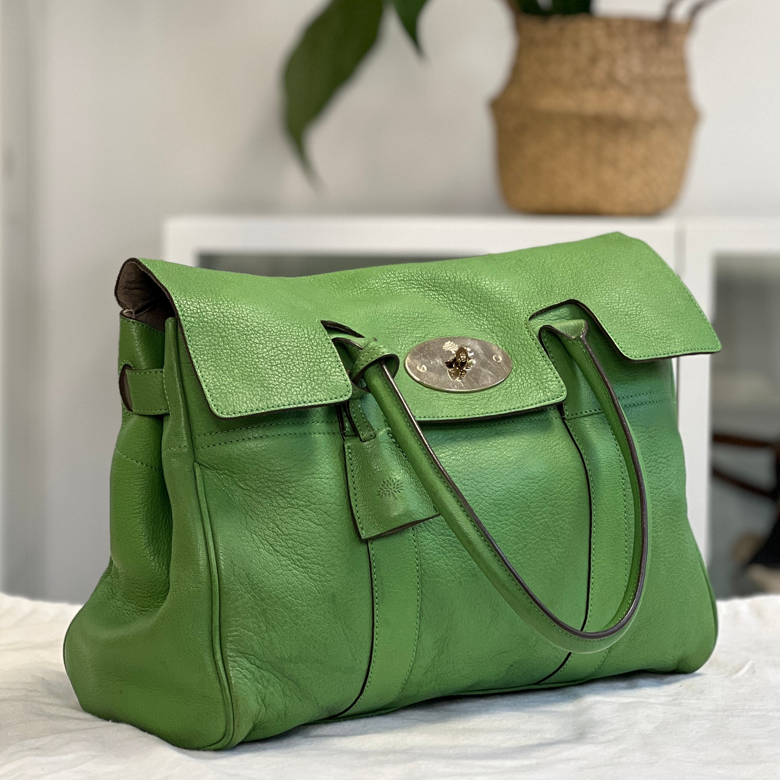 Description: This Mulberry Bayswater has double top handles with a Mulberry cloche and padlock. It has 4 base studs. It has a flap closure with a Mulberry postman’s lock. Inside there are 2 flat pockets and 1 zipped pocket. It has 2 interior buckles to adjust the side gussets.