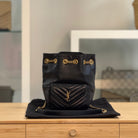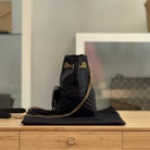 Description: This Saint Laurent Joe Mini Bucket Bag has a long strap that also acts as a drawstring fasten. On the front of the bag there is 1 exterior pocket with an envelope flap closure and magnetic press-stud fasten.